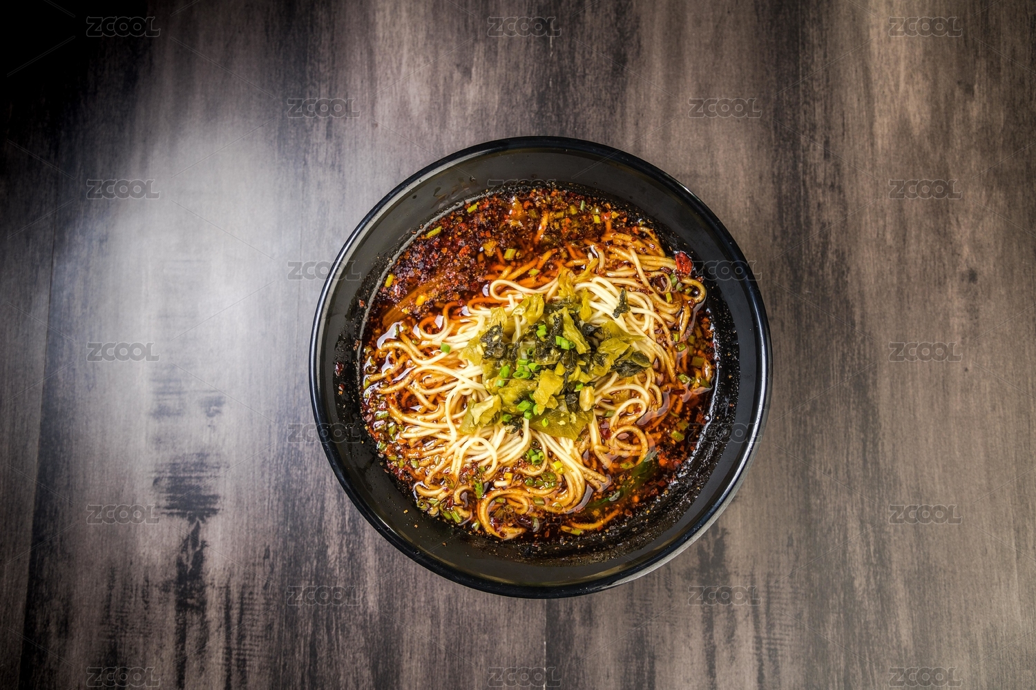 棕色木纹板上放着一碗榨菜肉丝米粉