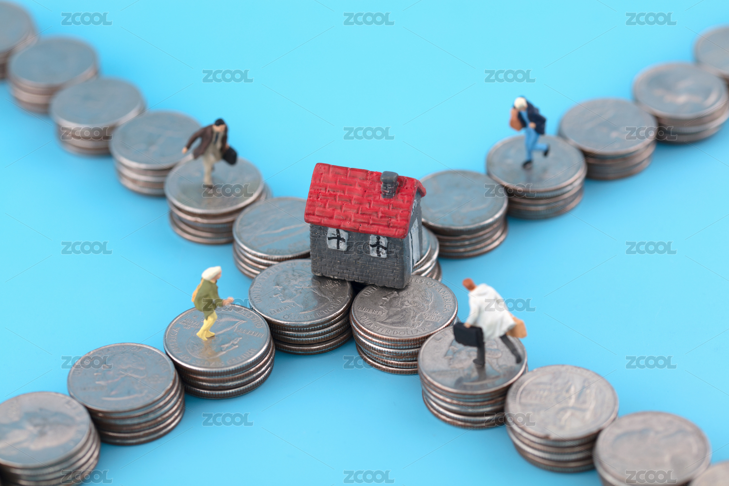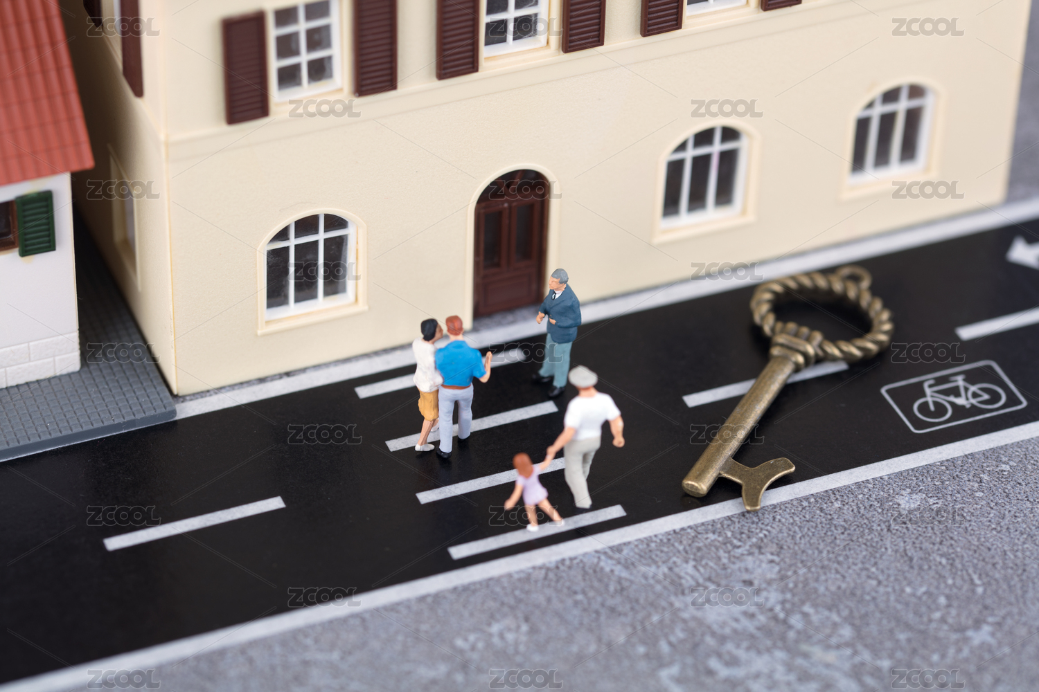 漂亮可爱的小女孩业务角色想投资房地产和用放大镜看房子模型搜索好的建筑。