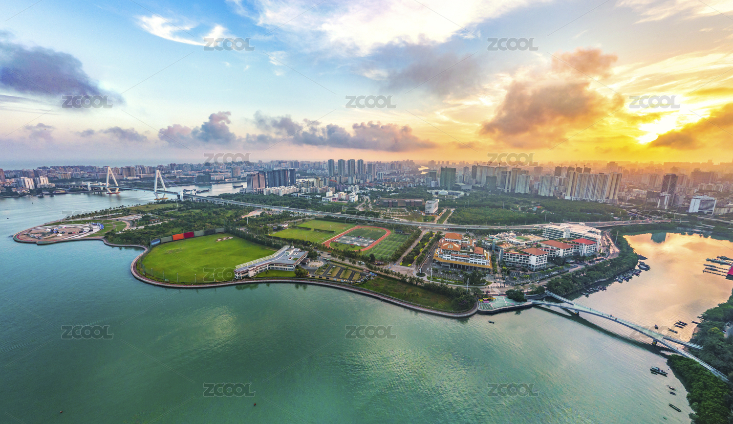 Aerial View of Buildings and Parks in Binhai Central Business District and Parks of Haikou City in Hainan Island of China
