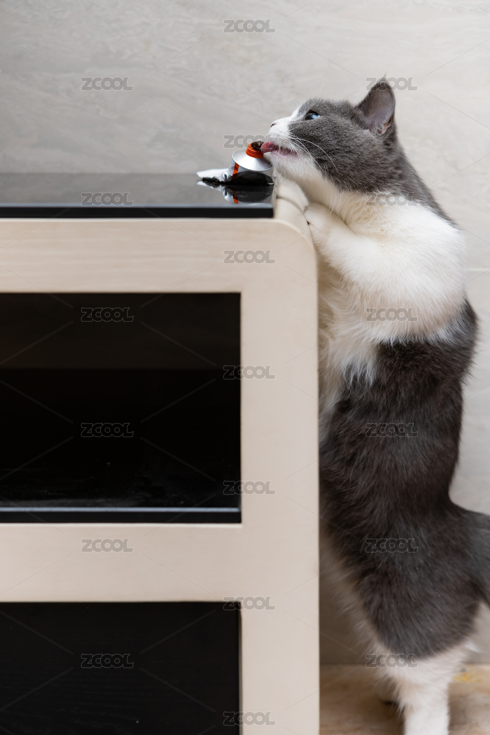 站在柜子最高处的英短蓝白猫猫