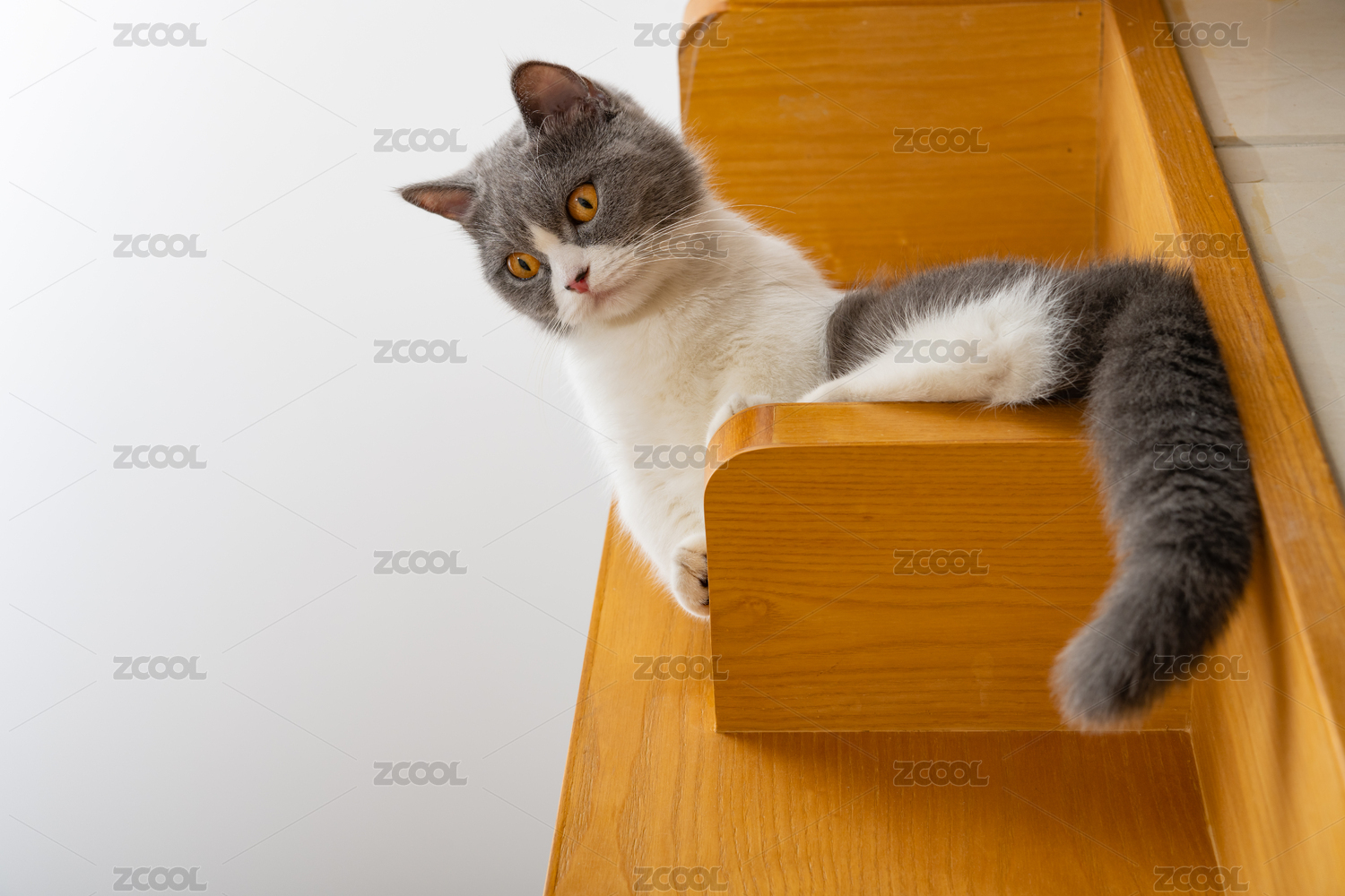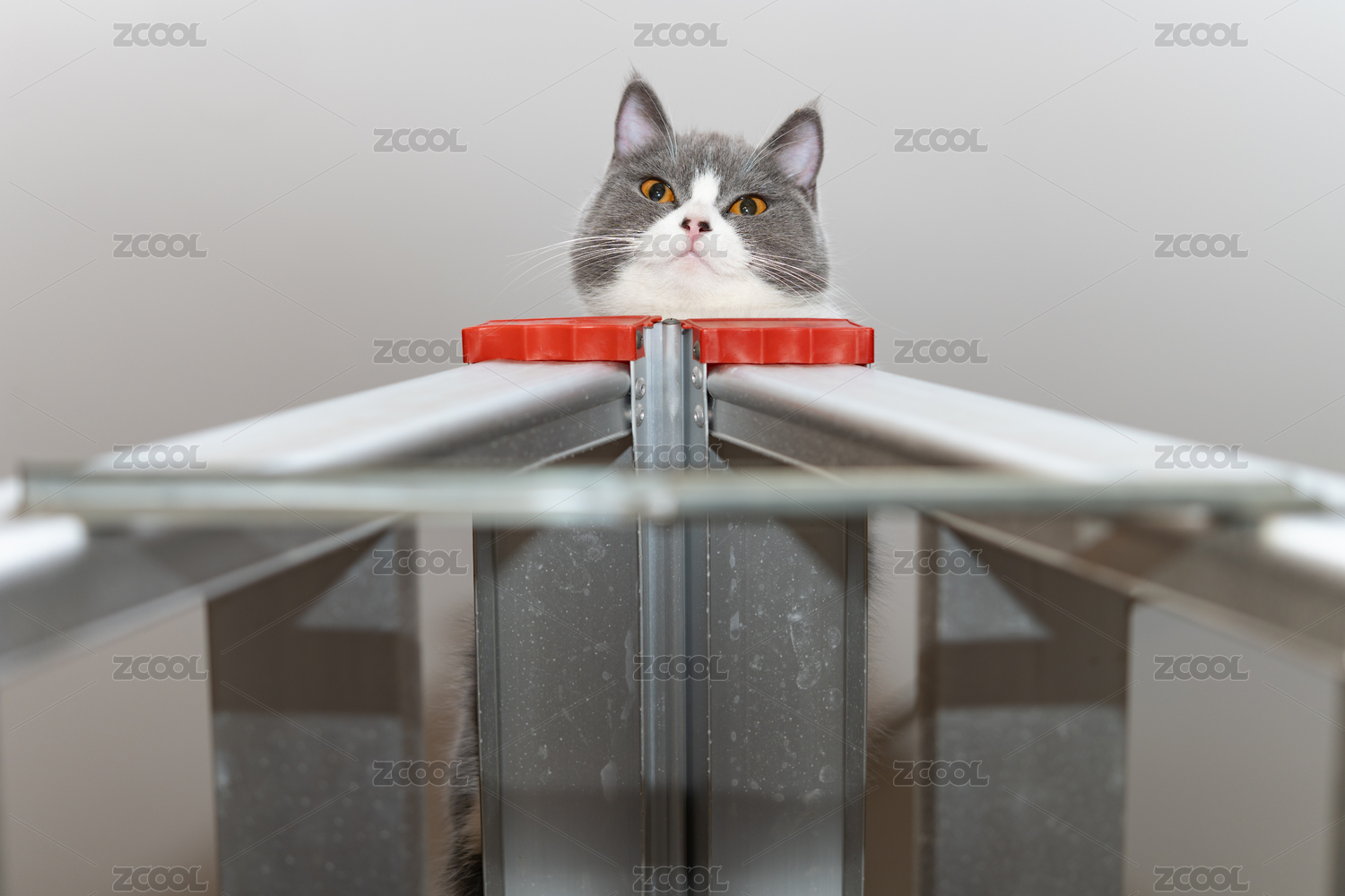 梯子顶部的英短蓝白猫猫
