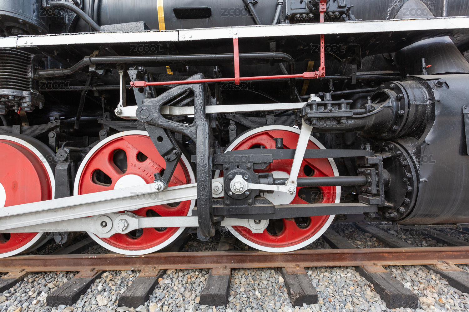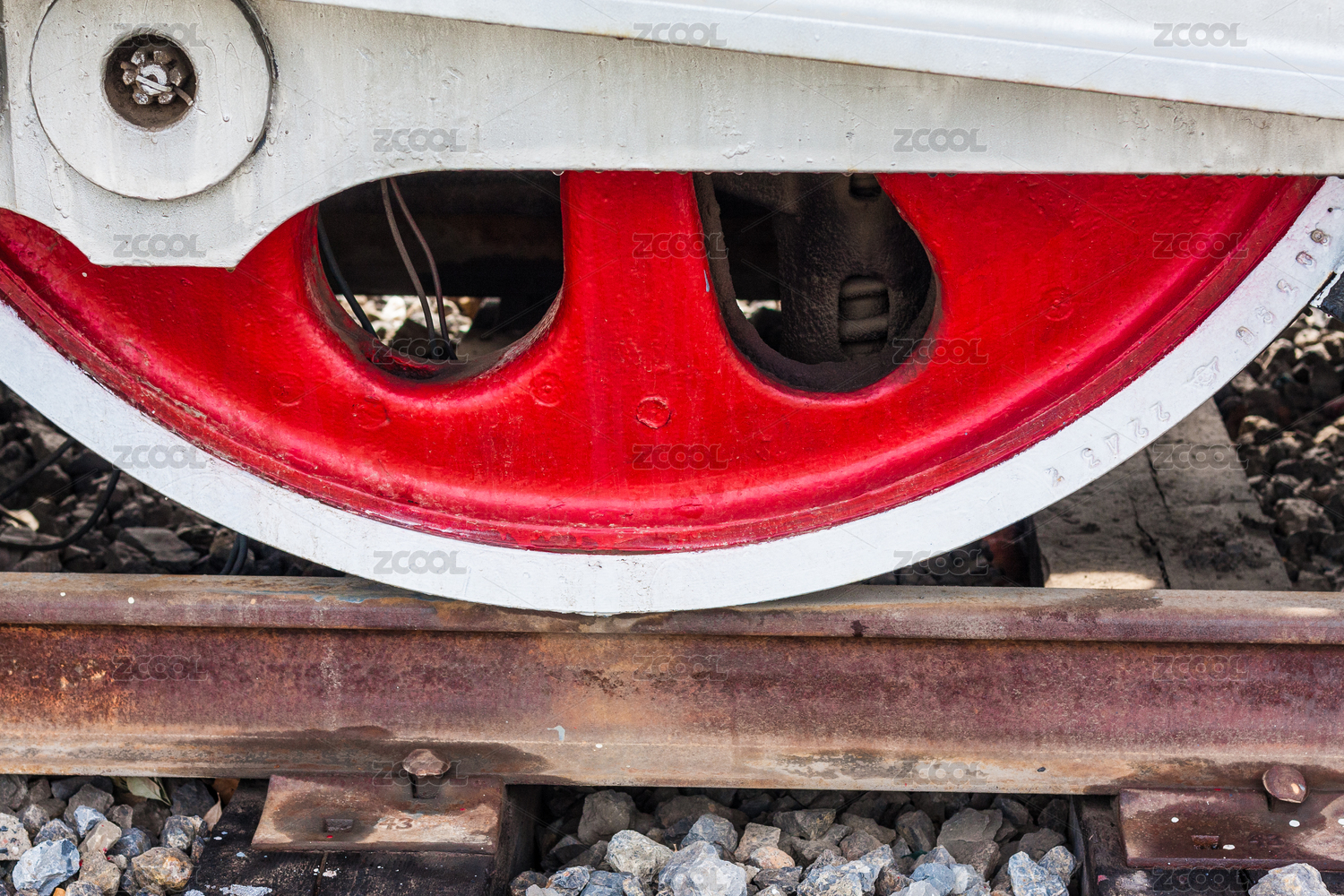 户外红黑涂装的老式蒸汽火车的驱动轮