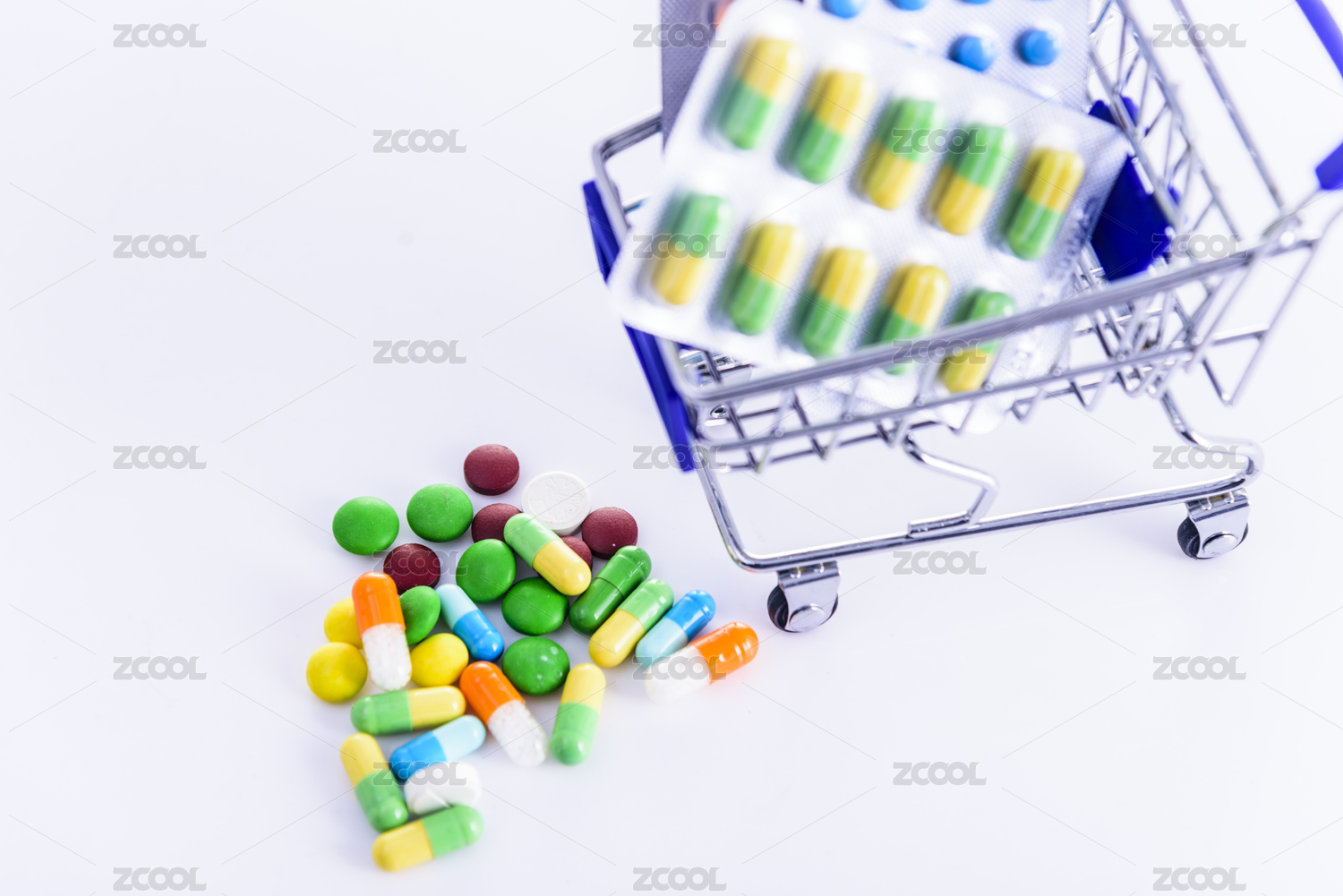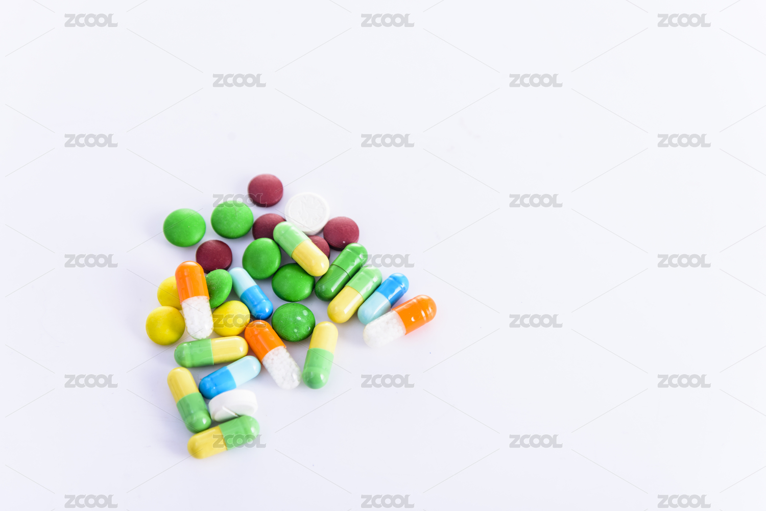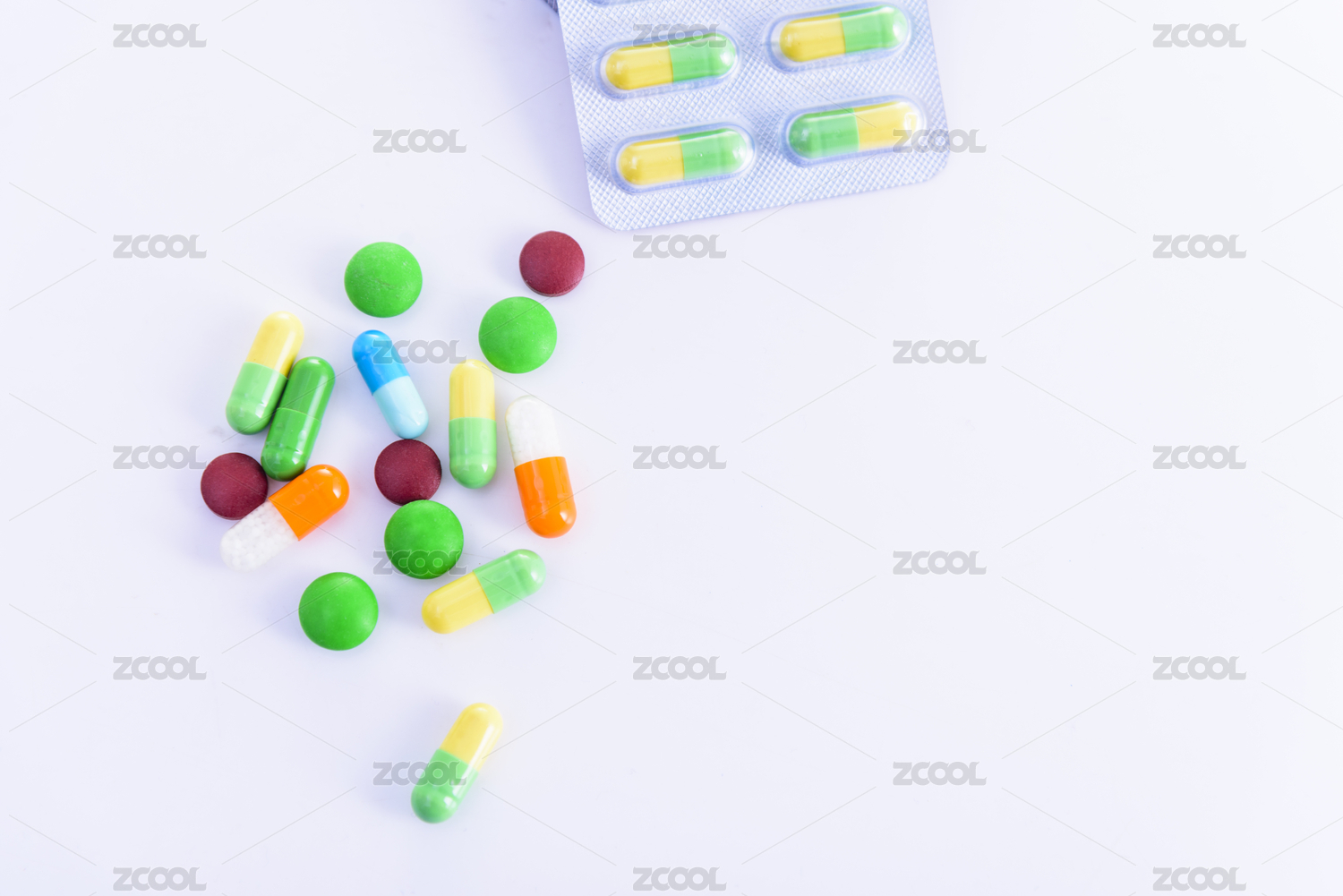 纯白色背景下的多种药品