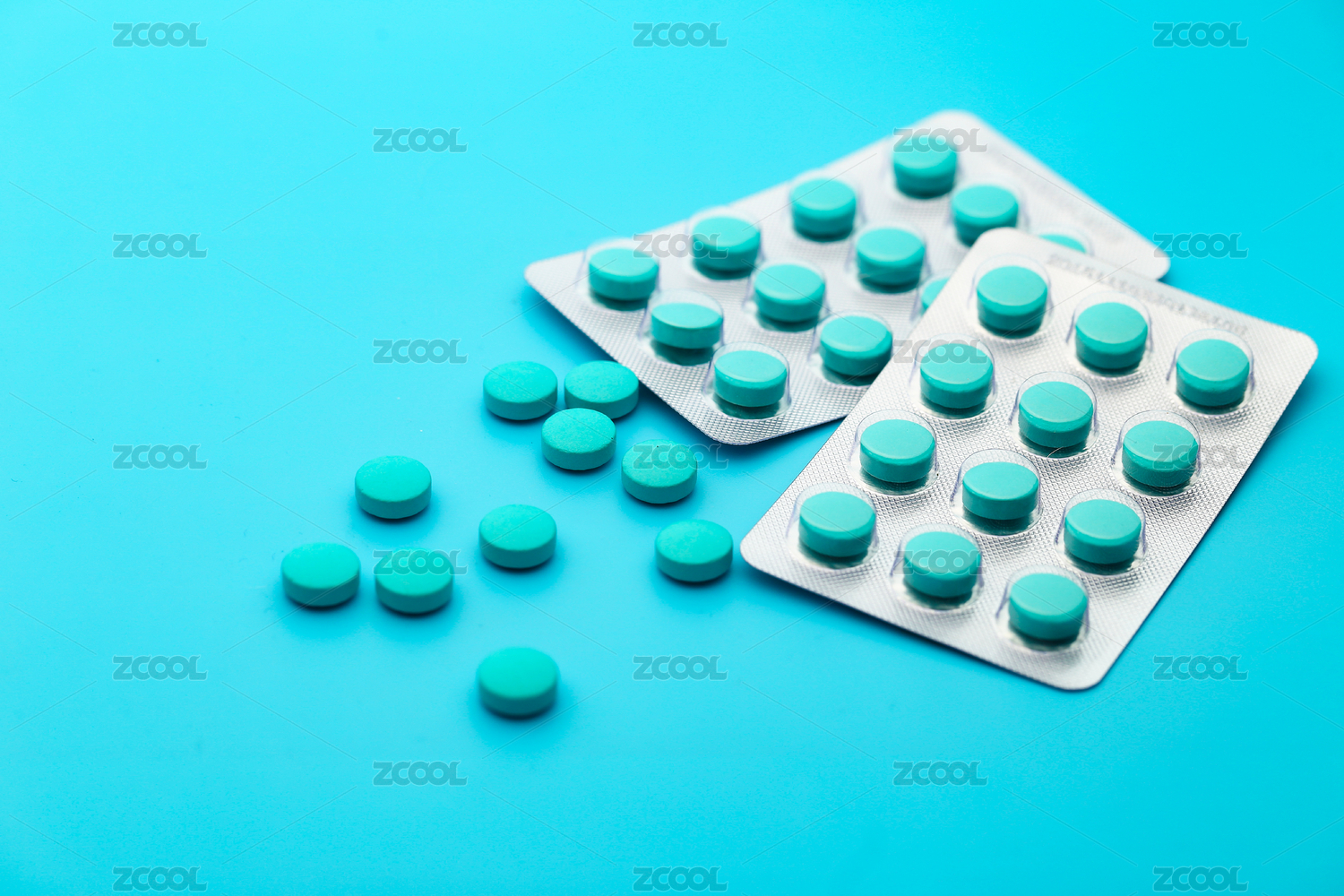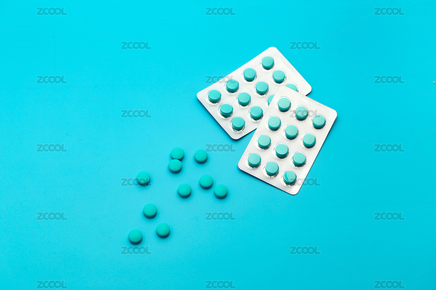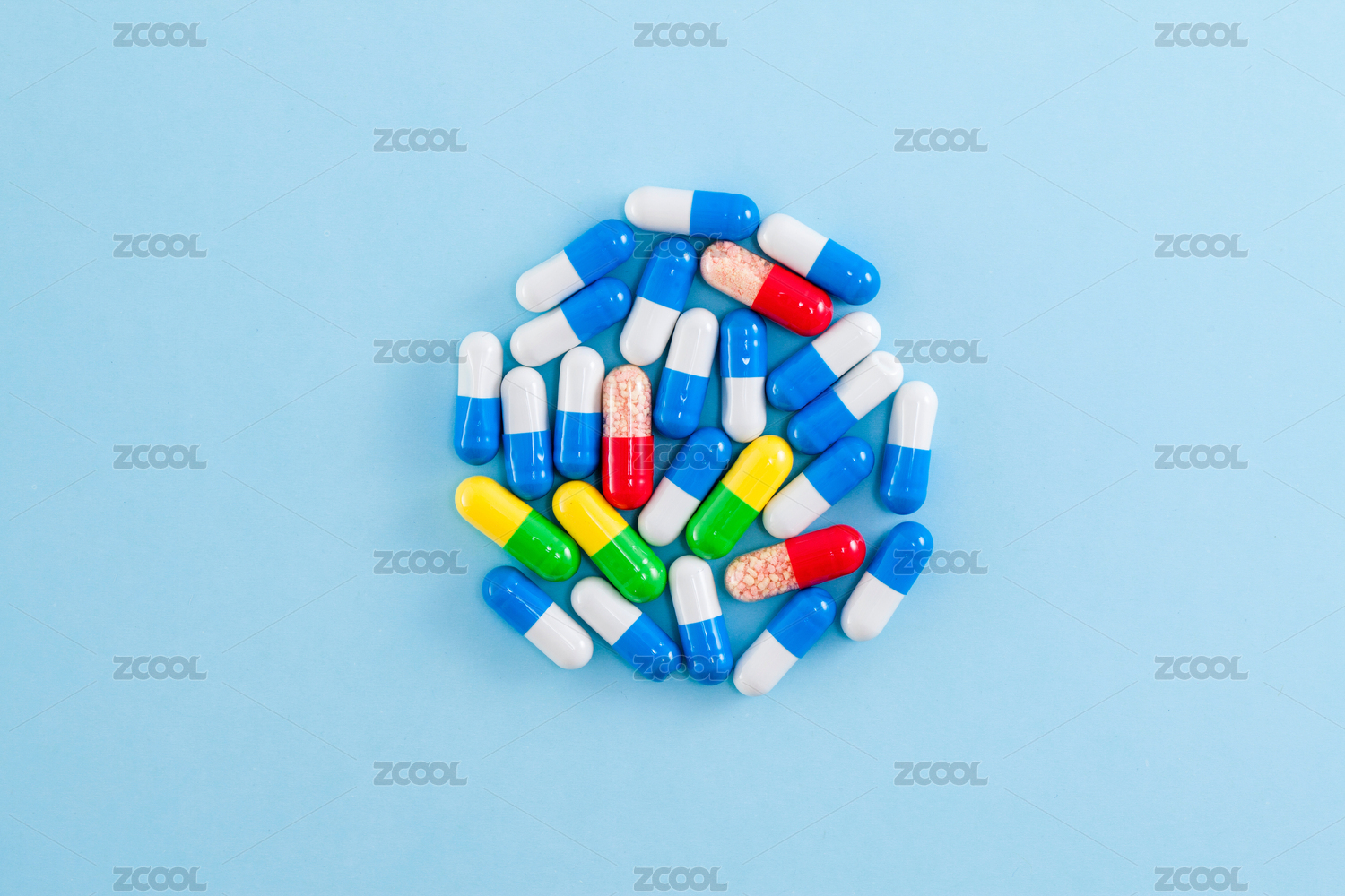 放在蓝色背景上的蓝白色药品