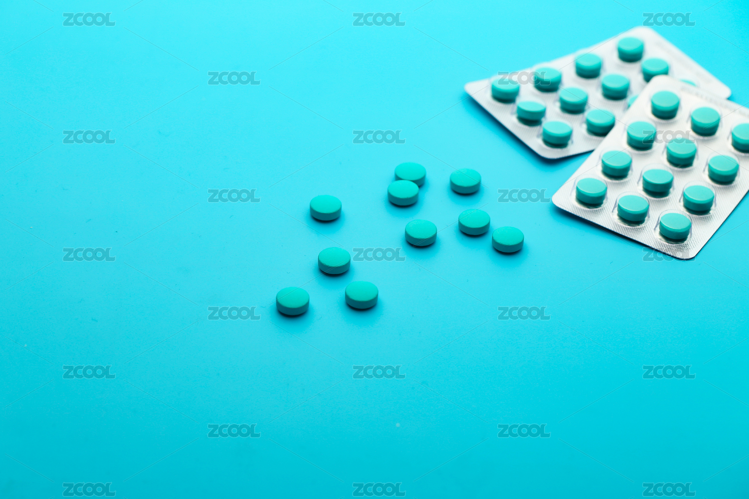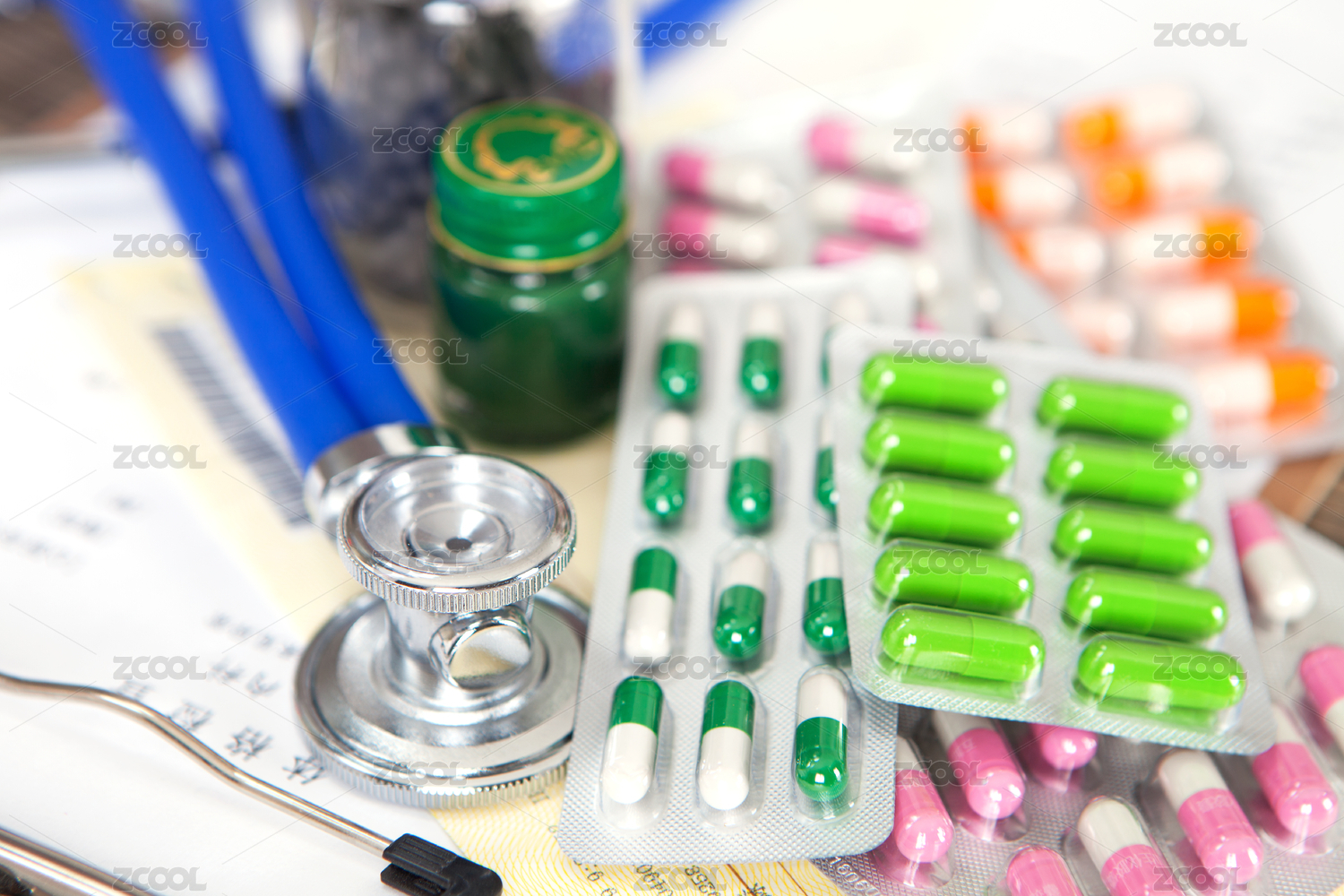 绿色的背景中放着的各类医疗药品