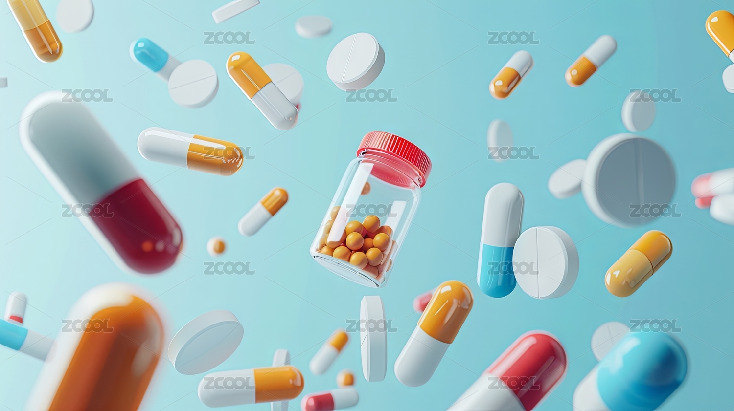 胶囊药片药品药瓶漂浮展示,三维简约背景