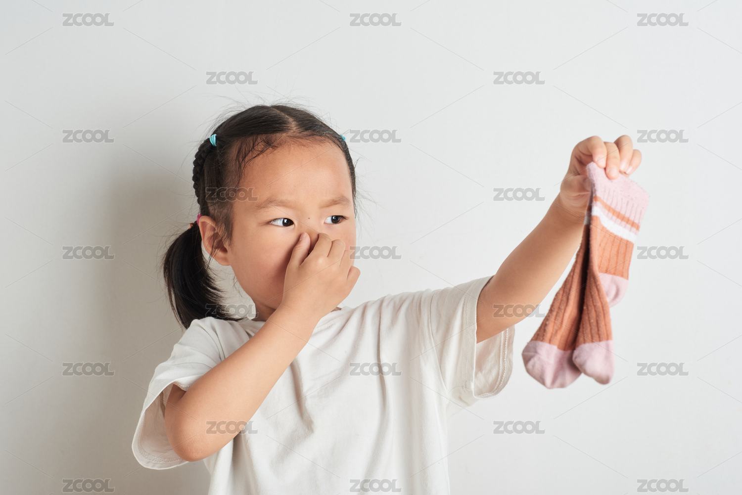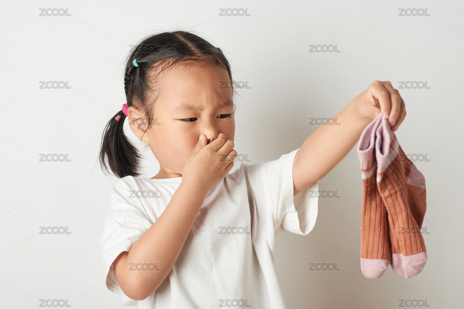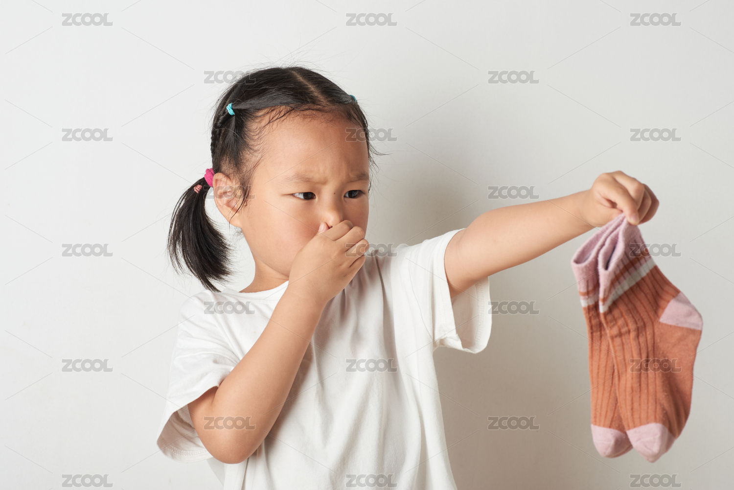 小女孩手拿袜子面露嫌弃表情