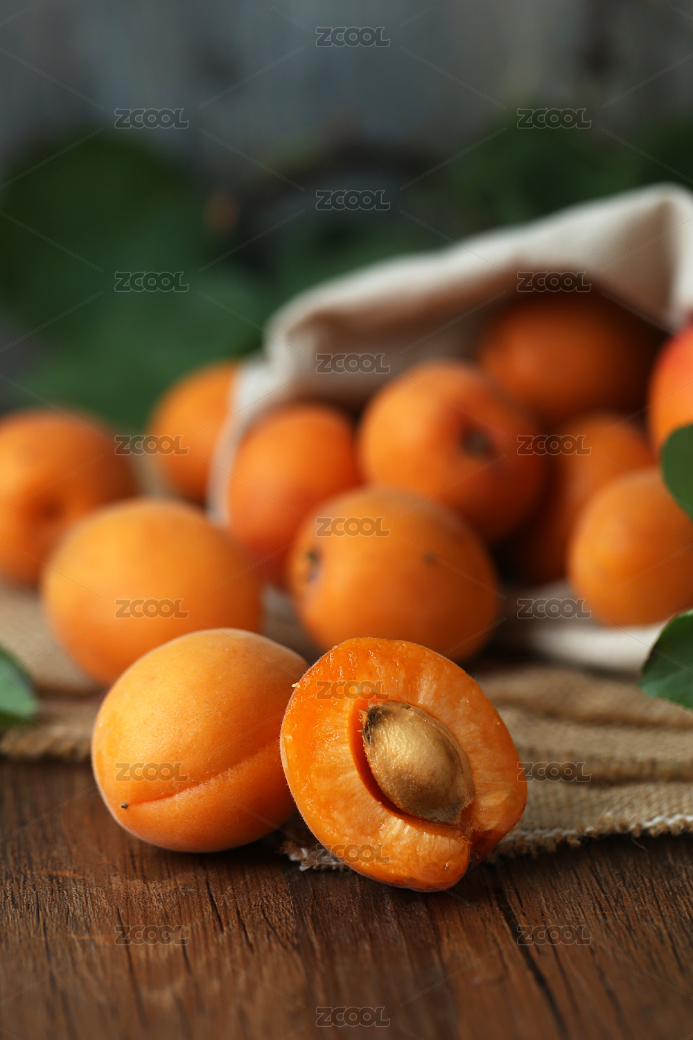 木桌上的杏放在粗麻布袋子里