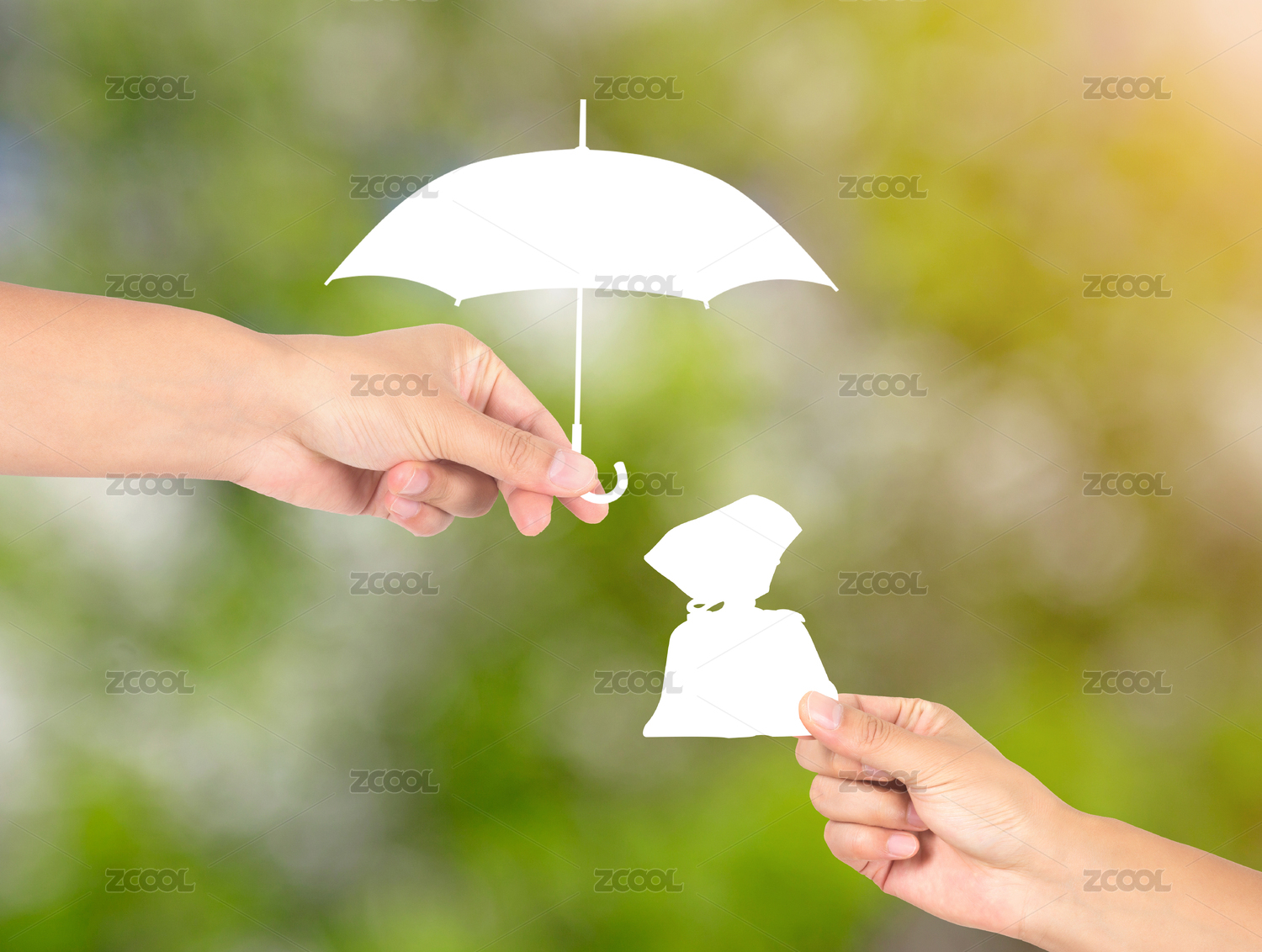 绿背景前一只手拿着雨伞为另一只手中拿着的钱袋子符号遮风挡雨