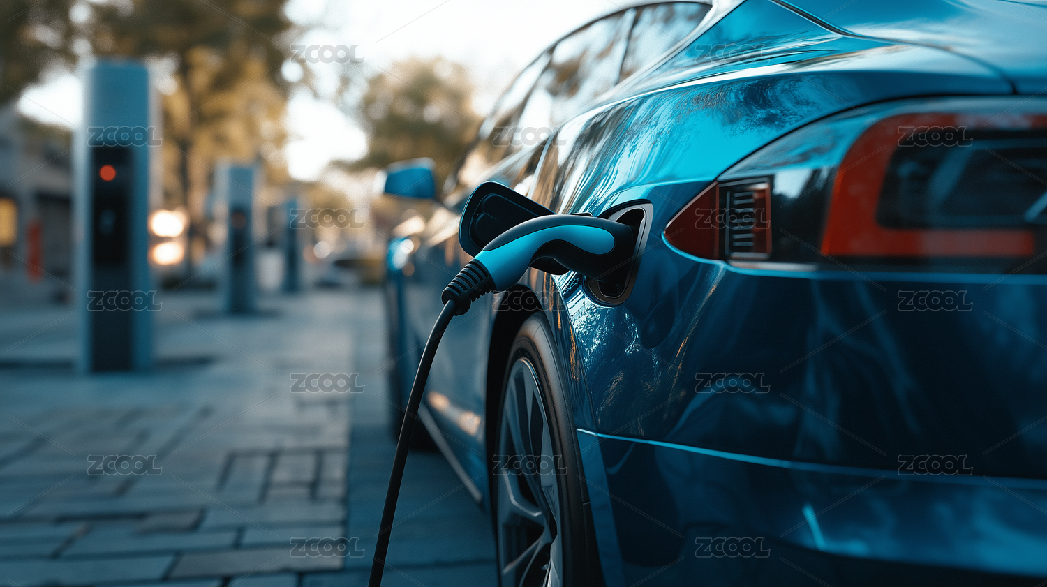 新能源汽车充电站和正在充电的电动汽车