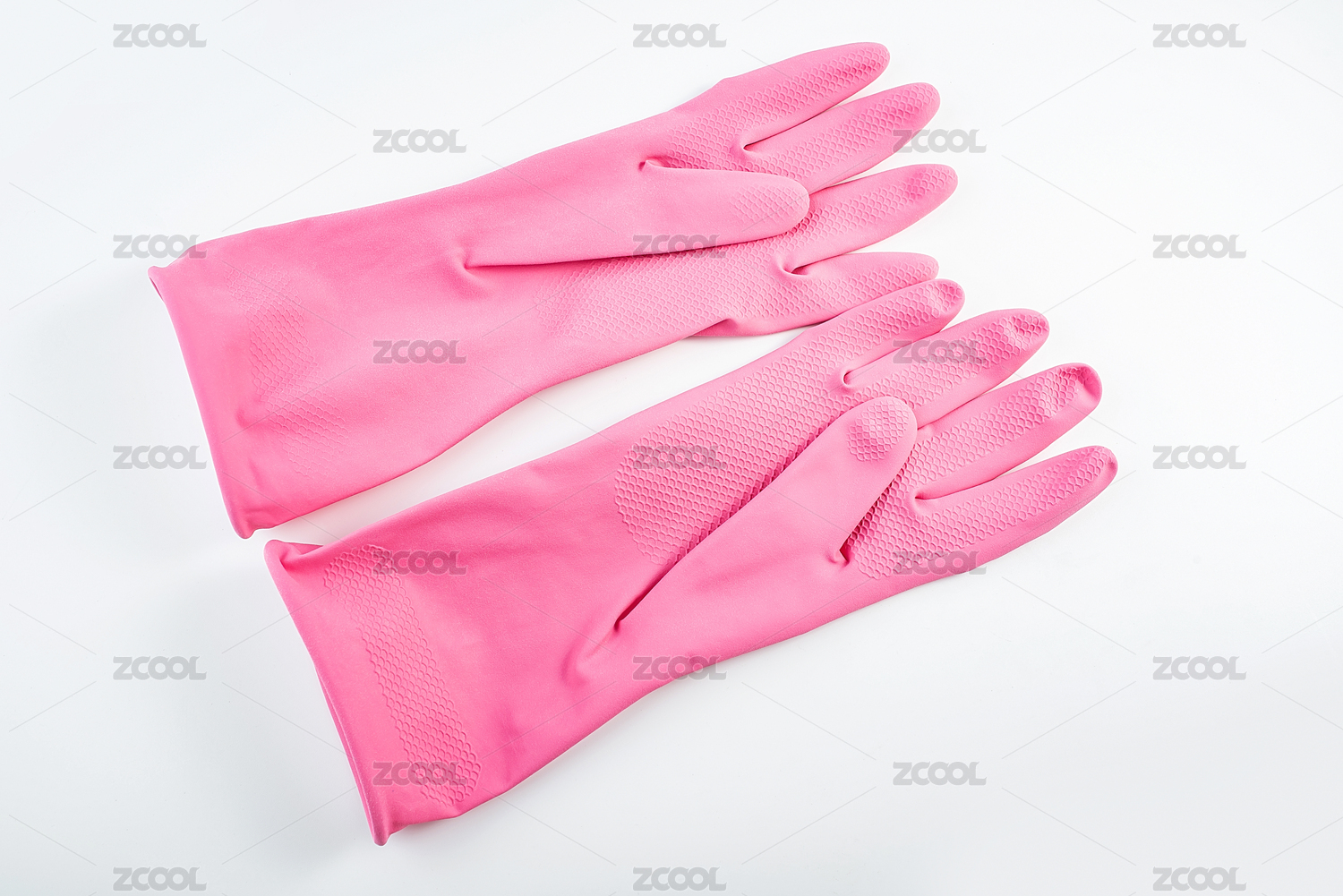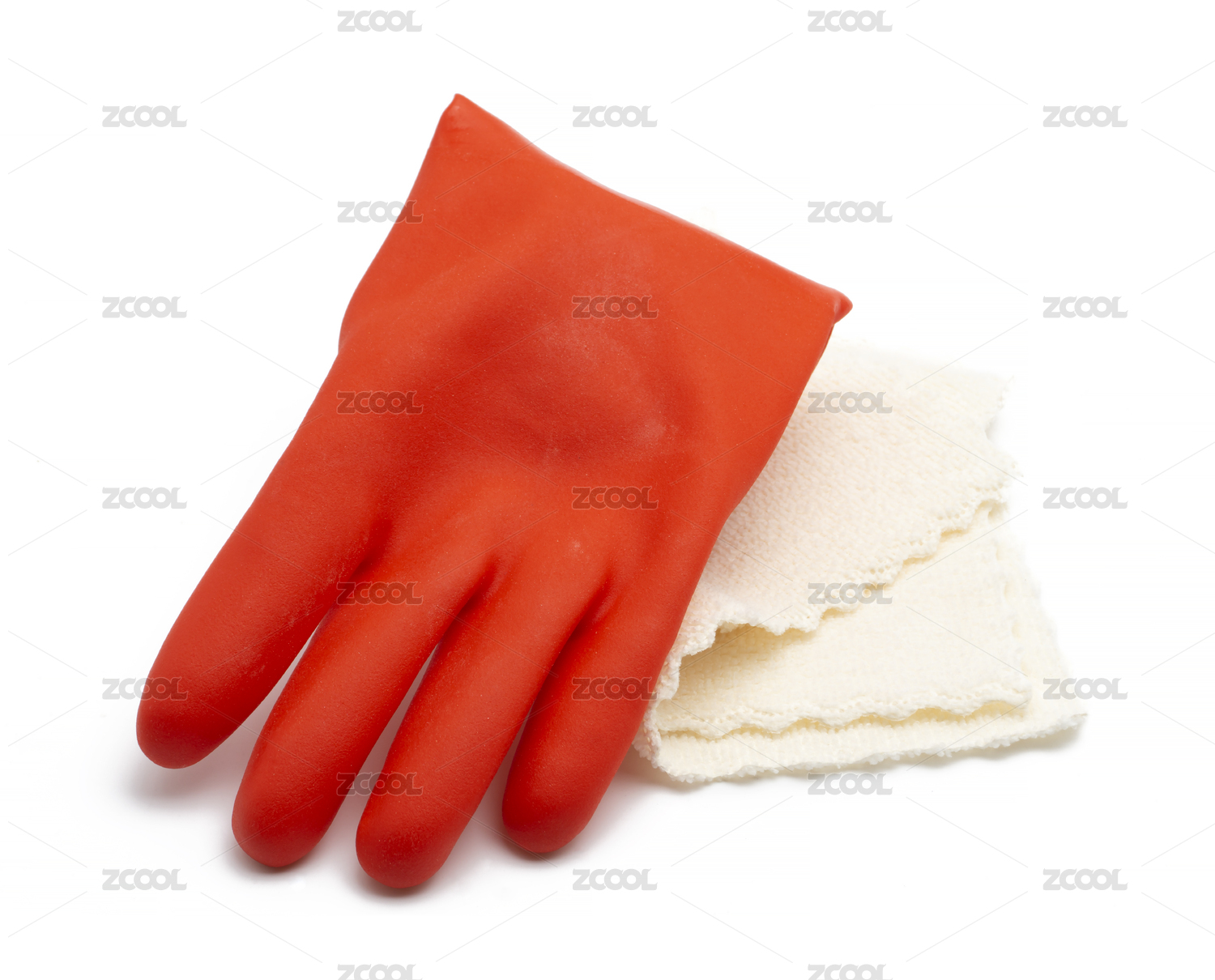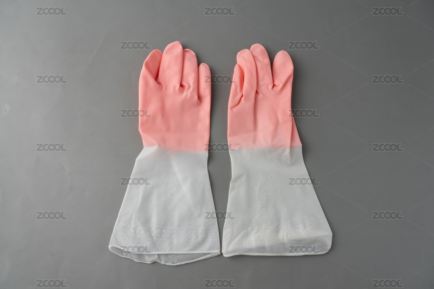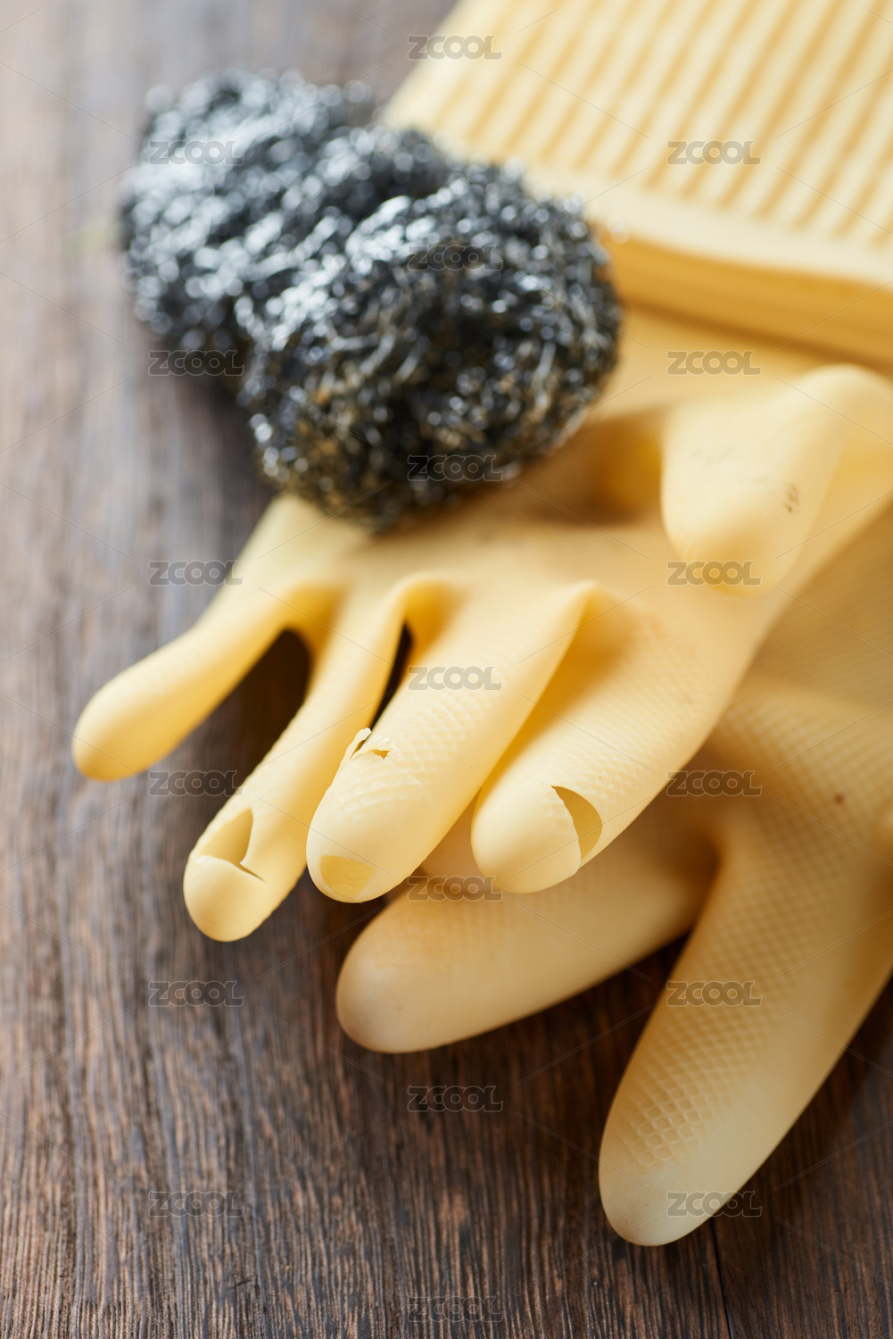 清洁工具百洁布橡胶手套盘子特写白色背景