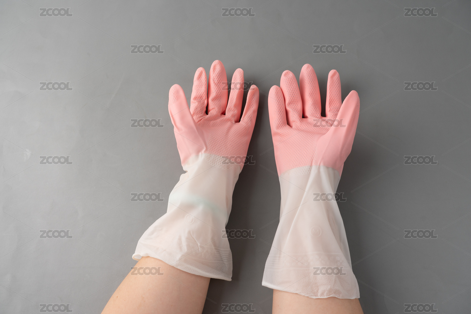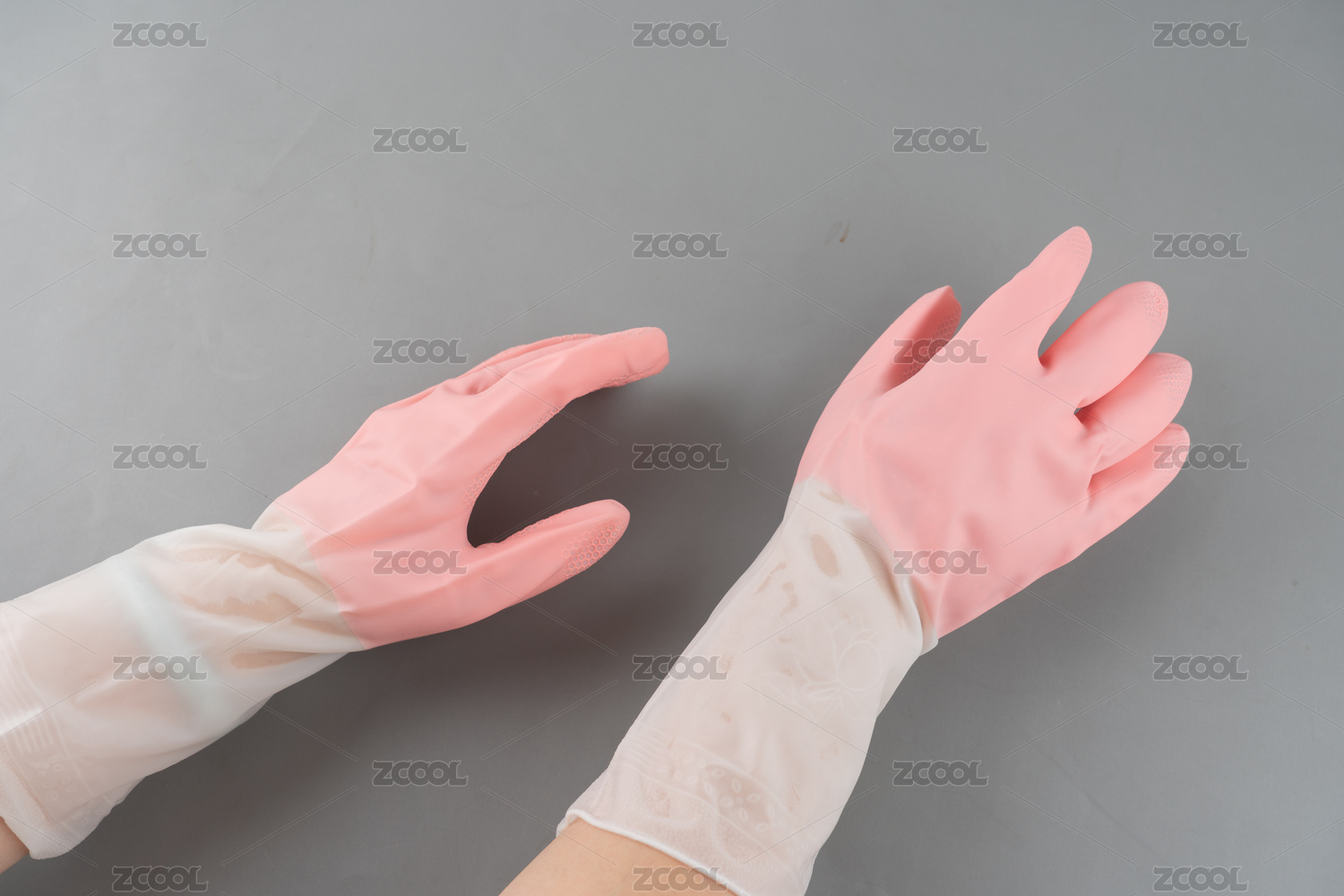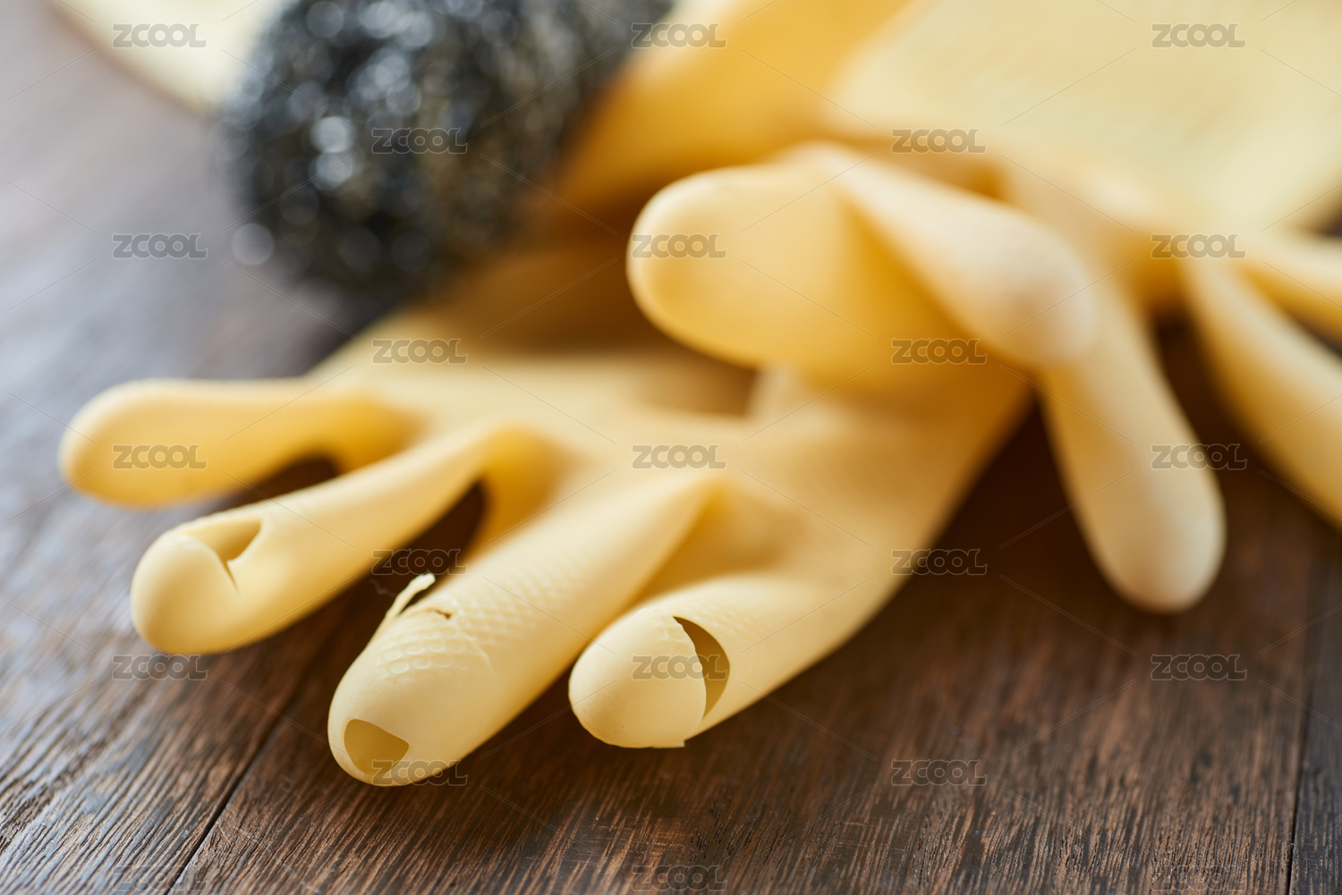 清洁工具百洁布橡胶手套盘子特写白色背景