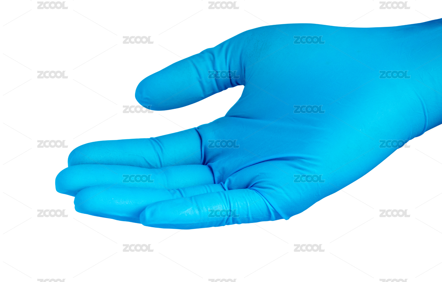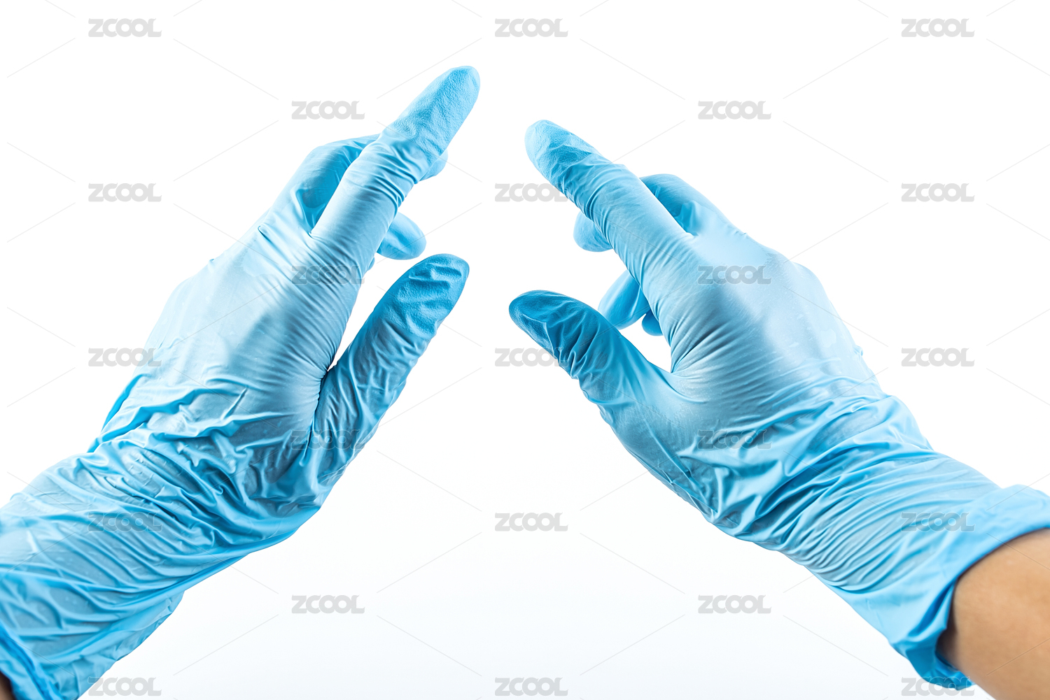 一双手戴着蓝色一次性橡胶手套在白背景上