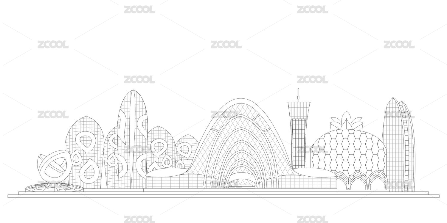 珠海中国风黑白线条地标建筑描边插画矢量