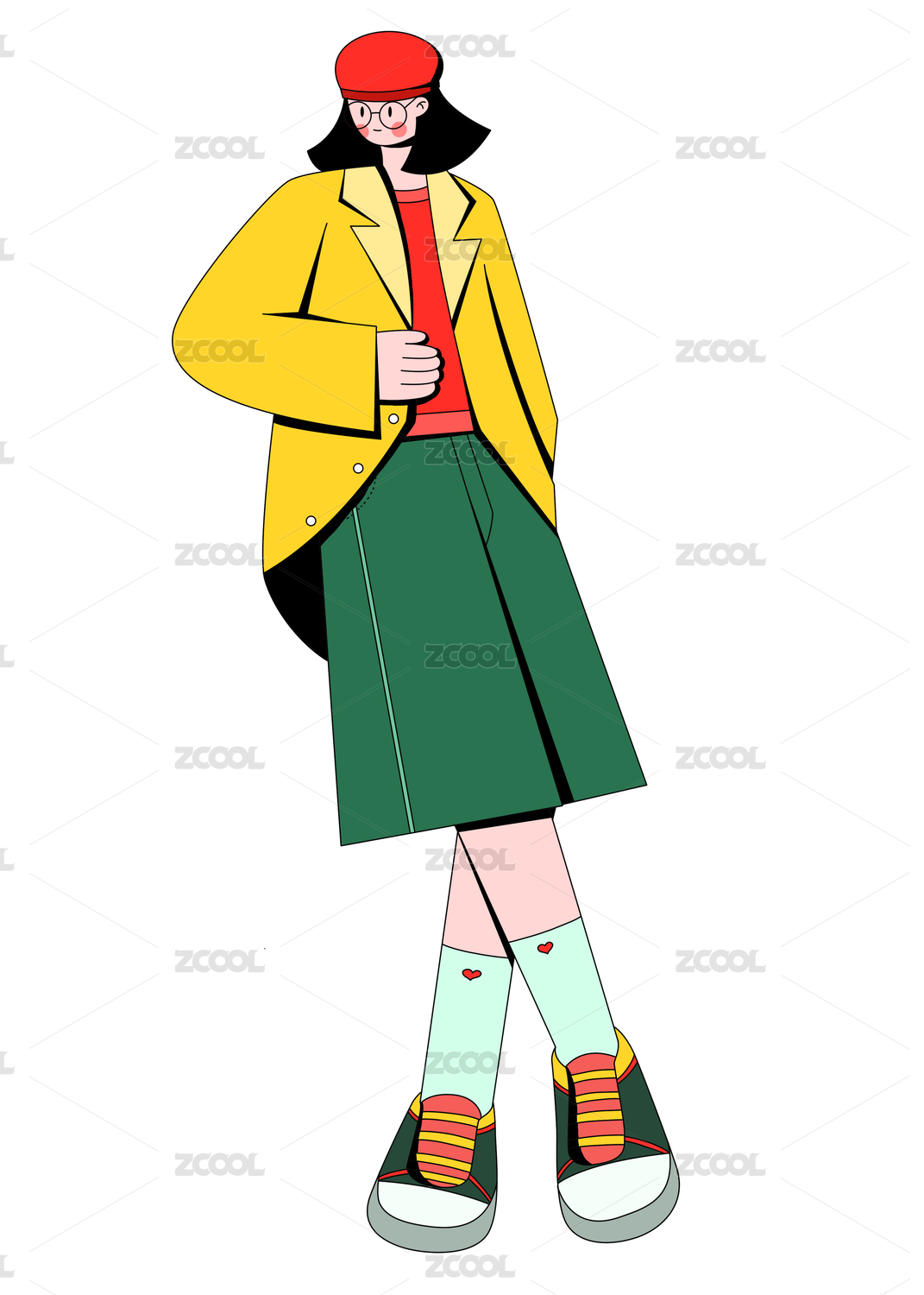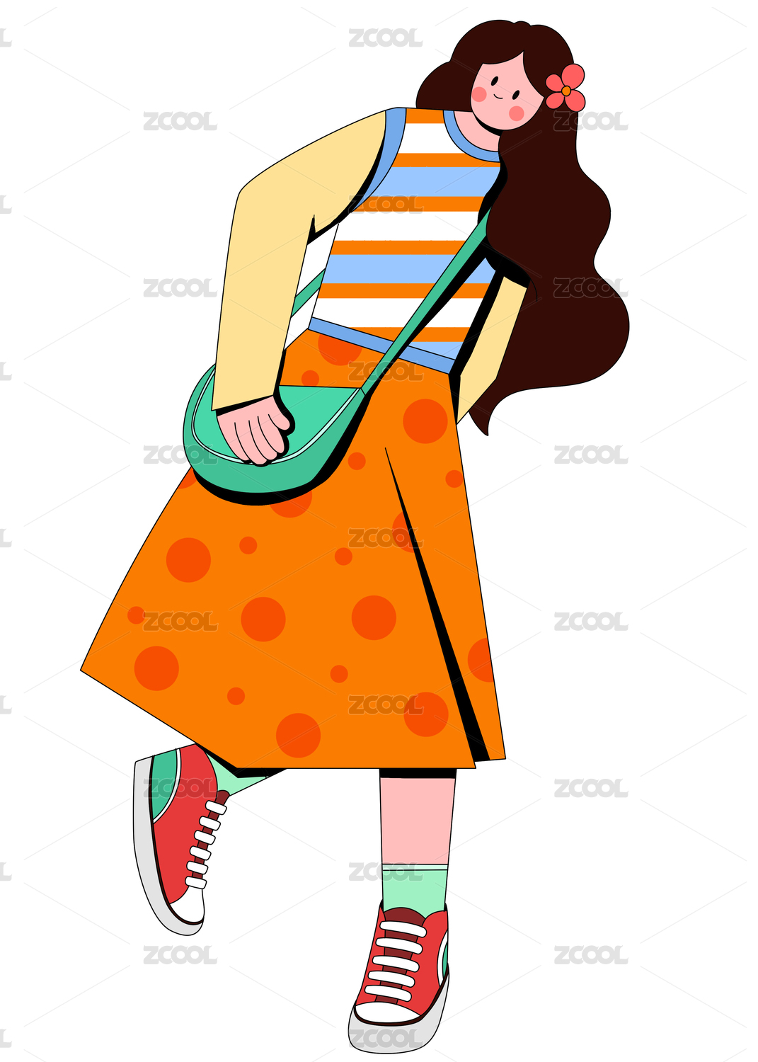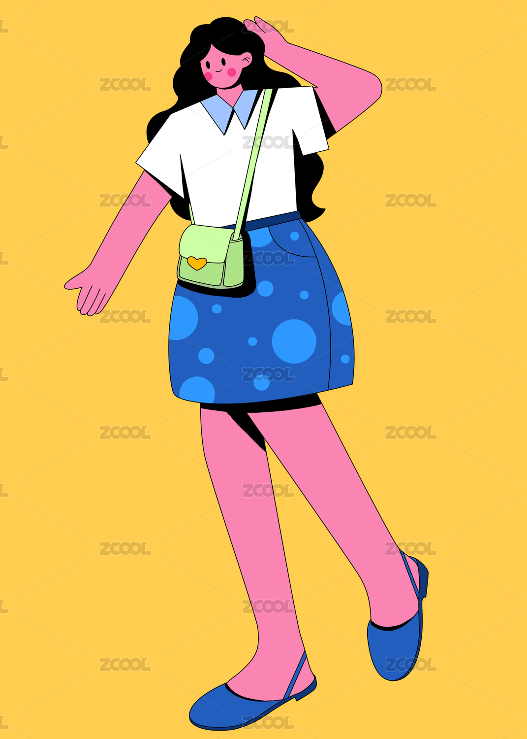 扁平风描边小清新波点短裙女孩