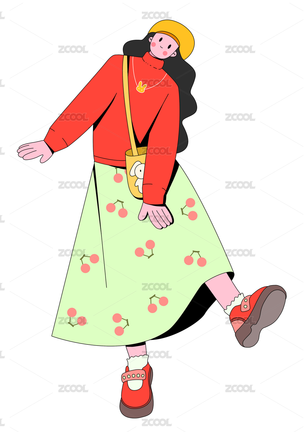 扁平风描边小清新樱桃裙女孩