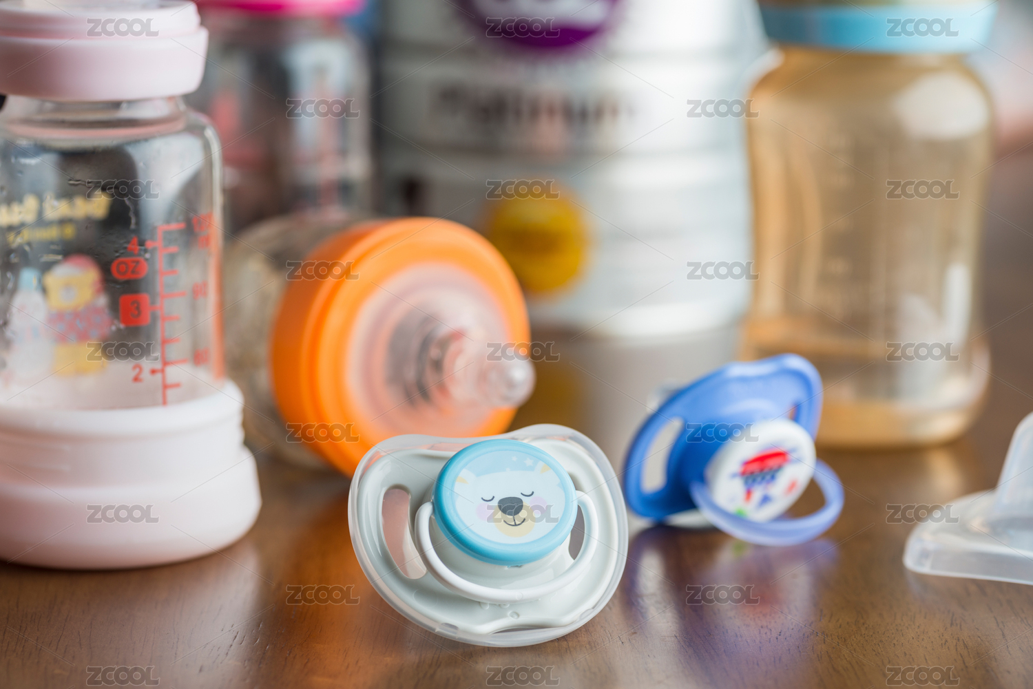 实木桌面上的安抚奶嘴和奶瓶