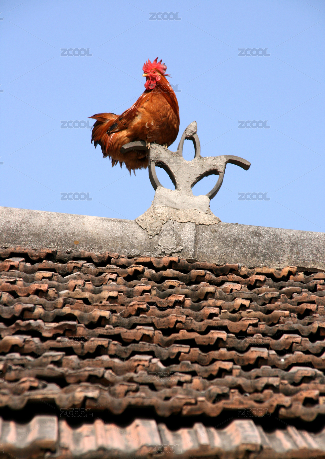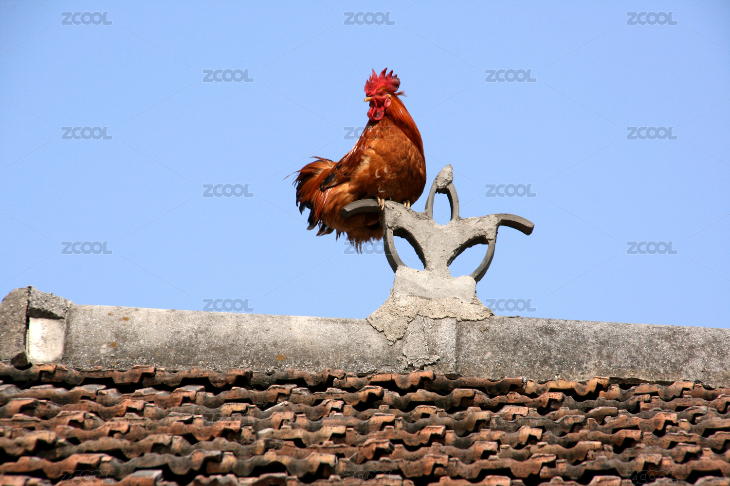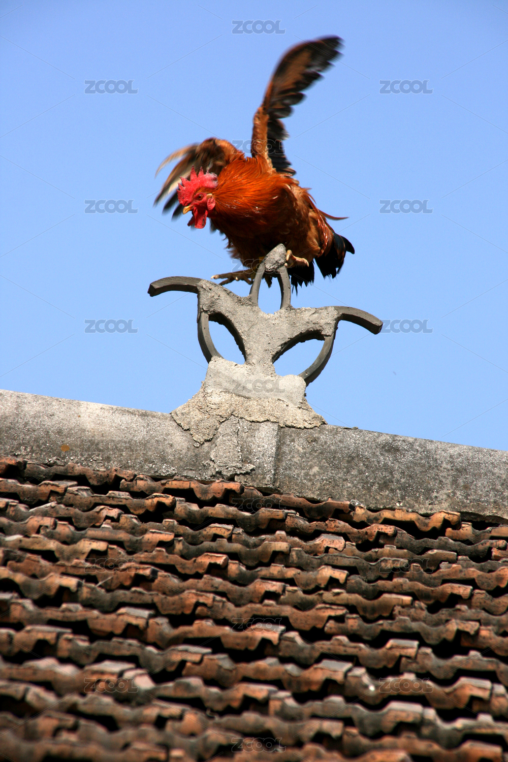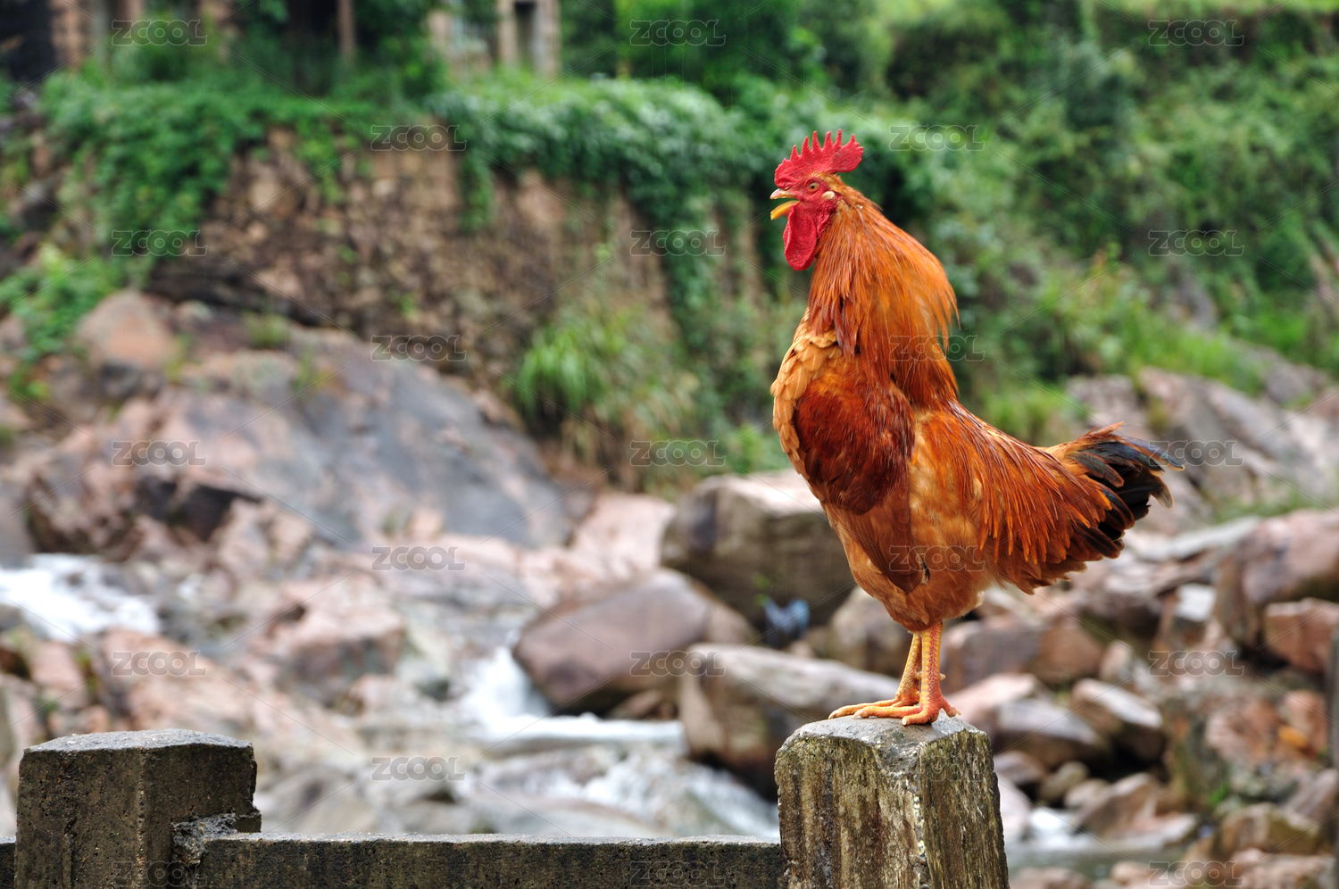 一只棕红色的公鸡在昂首打鸣