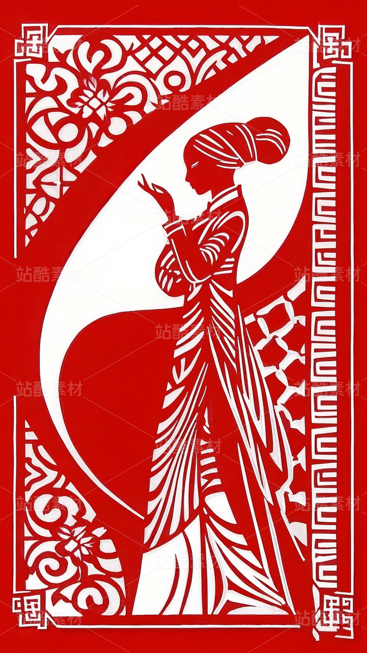 剪纸艺术风格 + 对角线构图 + 剪纸女性造型