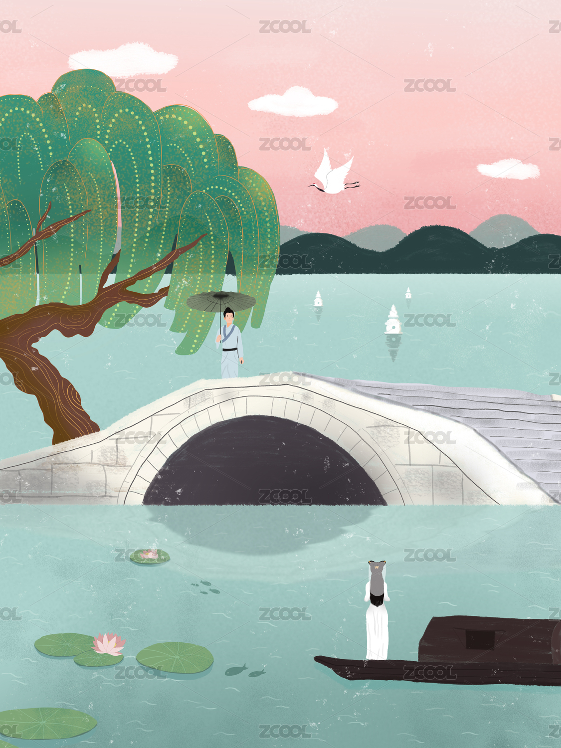 杭州西湖白蛇传白娘子许仙天堂伞线性插画