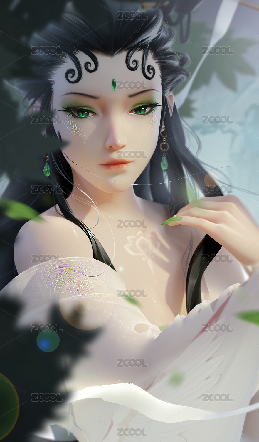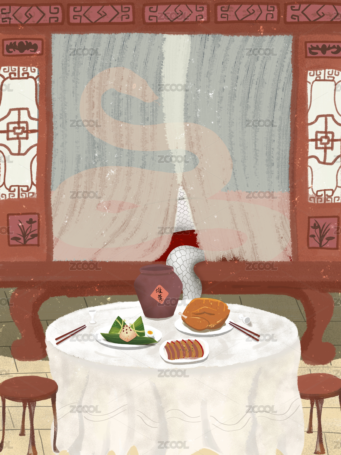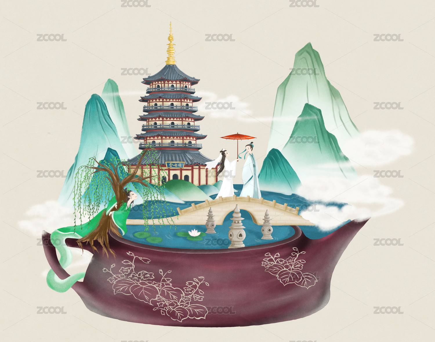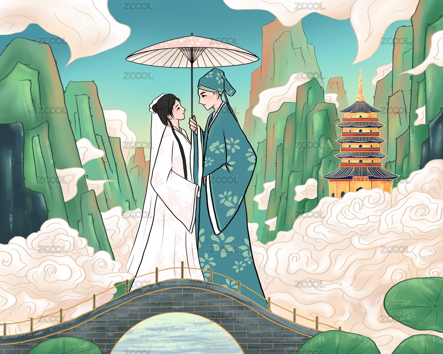 中国神话传说青蛇白蛇桃花山水国潮插画