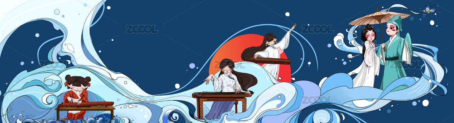 一张有弹古琴女子和许仙白娘子的装饰插画