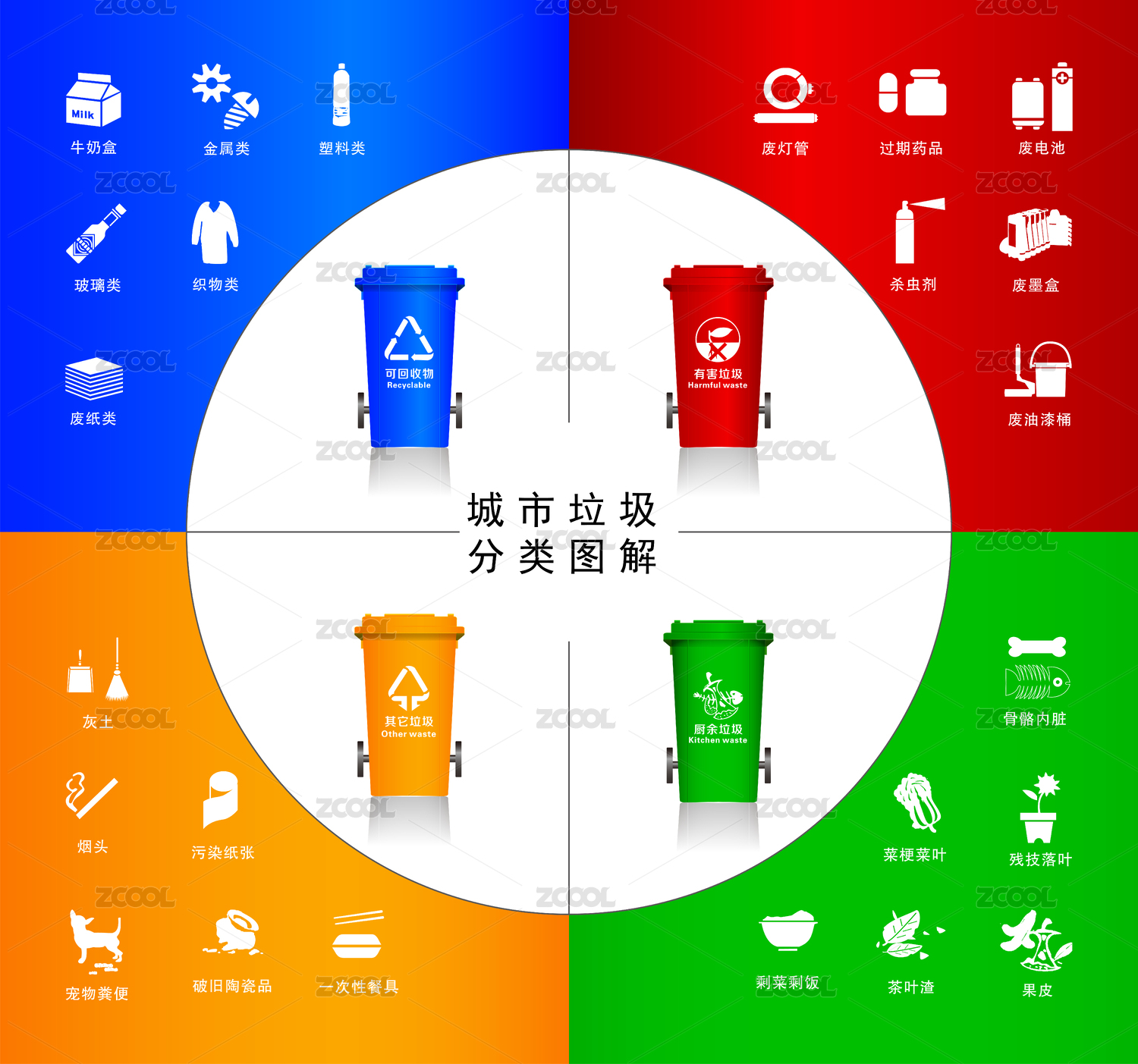 四色垃圾分类图标及不同垃圾分列举例