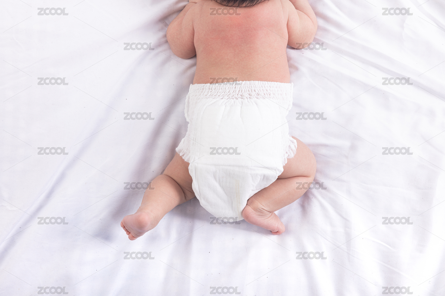 穿着纸尿裤趴在白色床上的新生儿宝宝