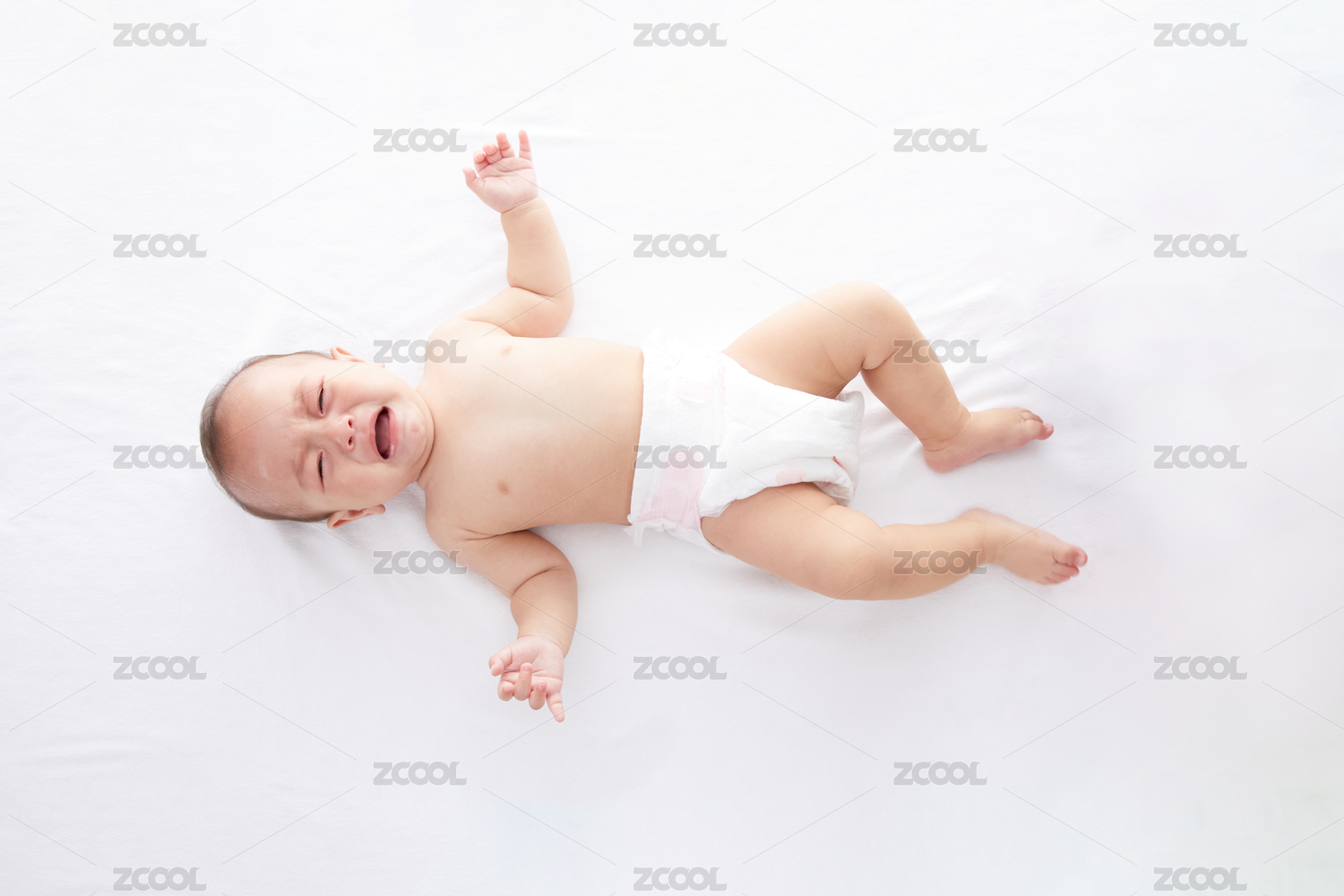 穿着尿布湿纸尿裤大哭发脾气的婴儿宝宝