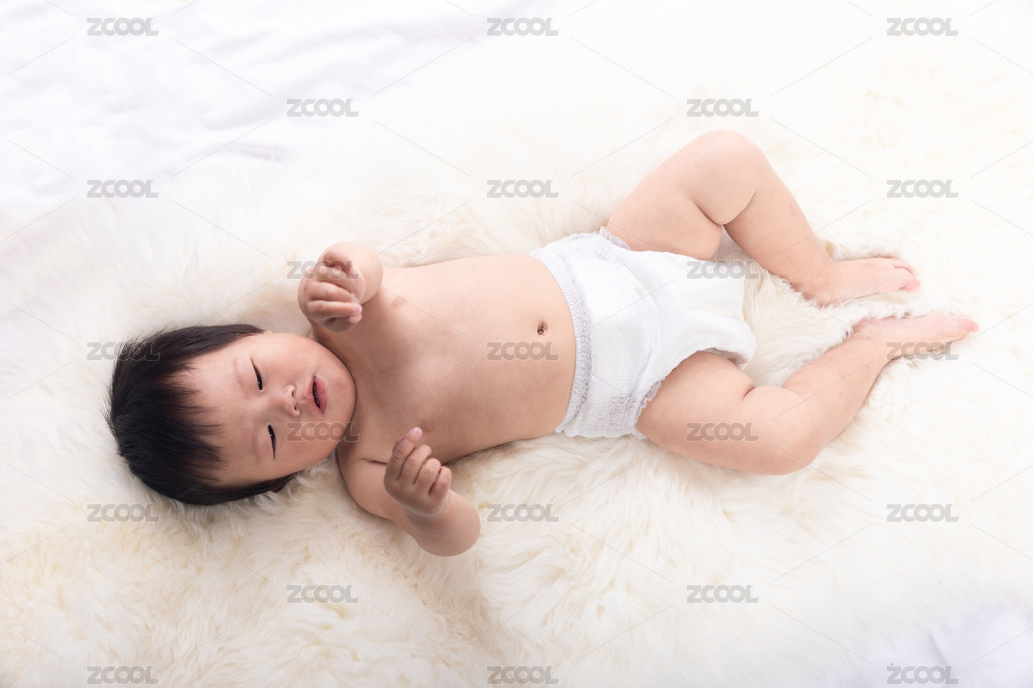 穿着纸尿裤躺在白色羊毛毯上的婴儿
