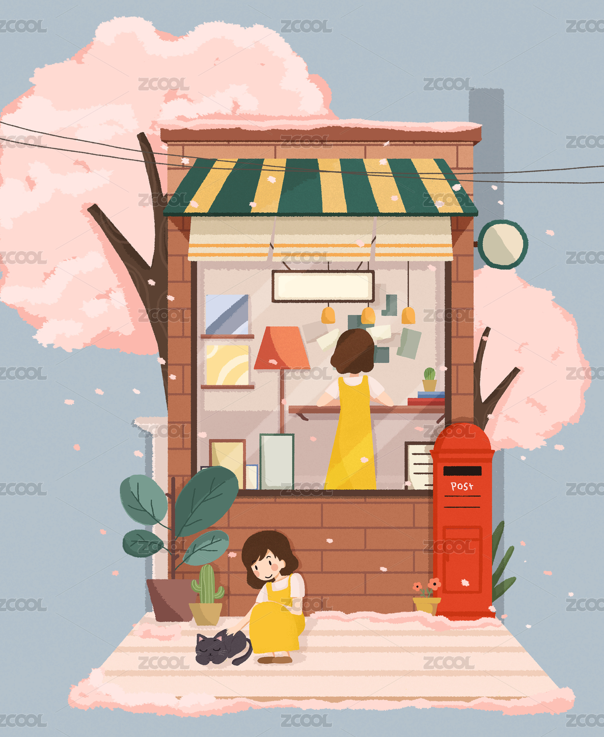 在邮局邮寄明信片的女孩