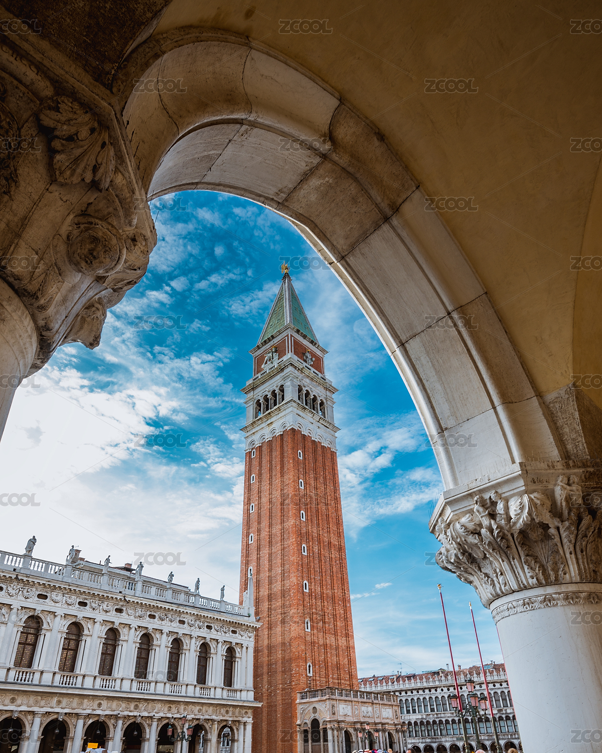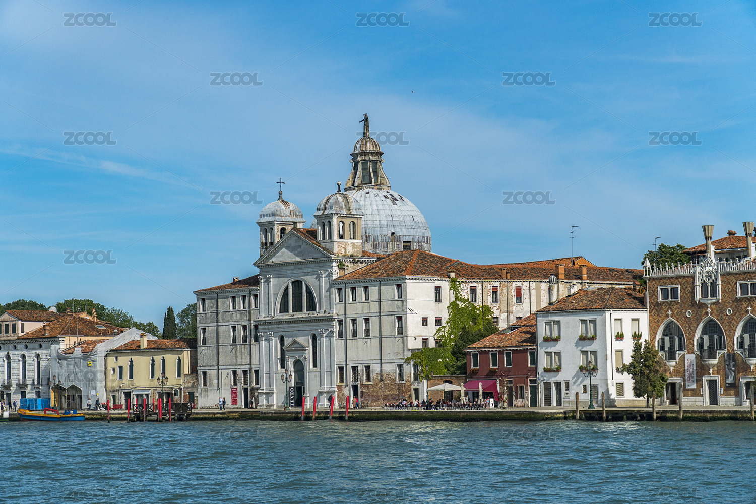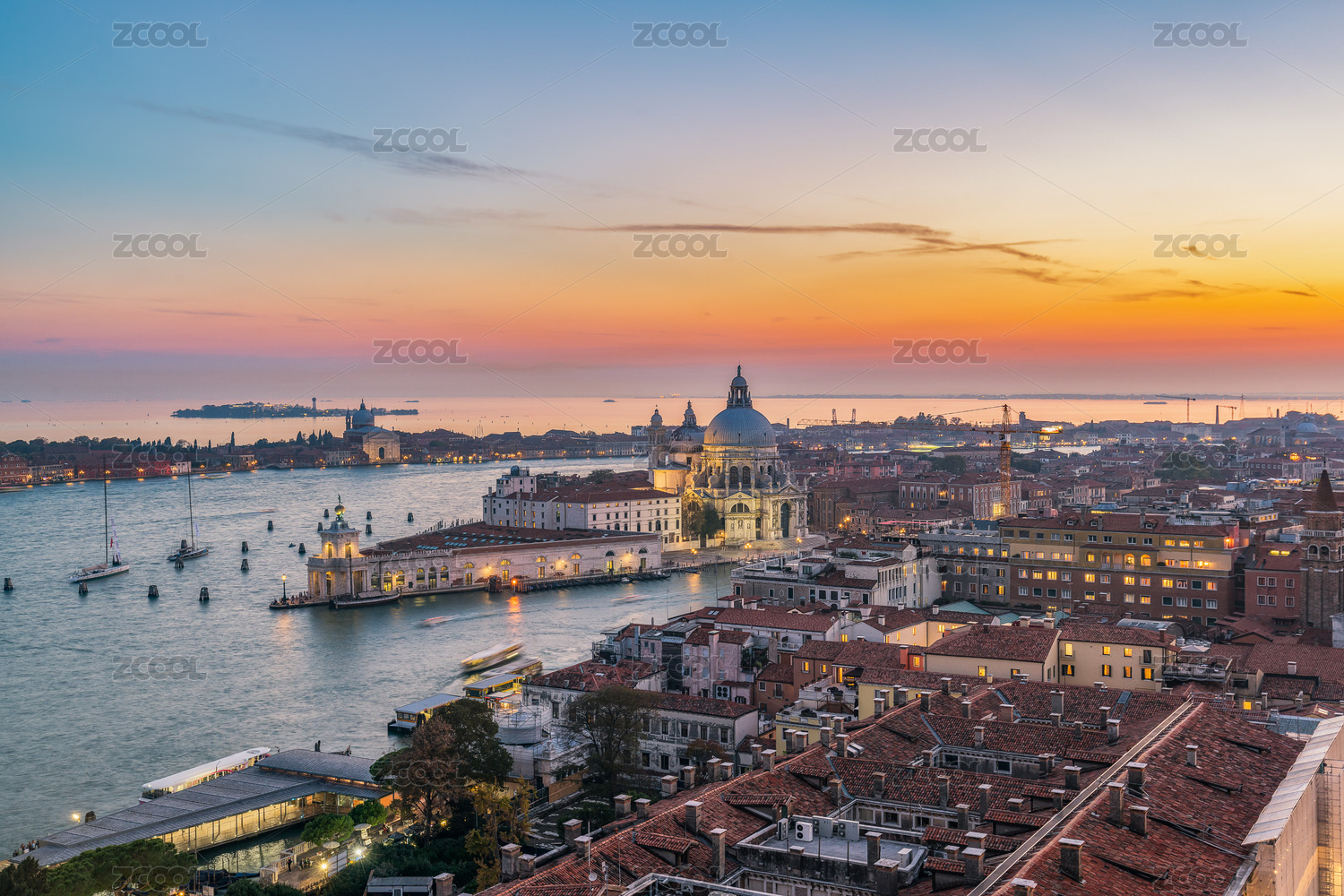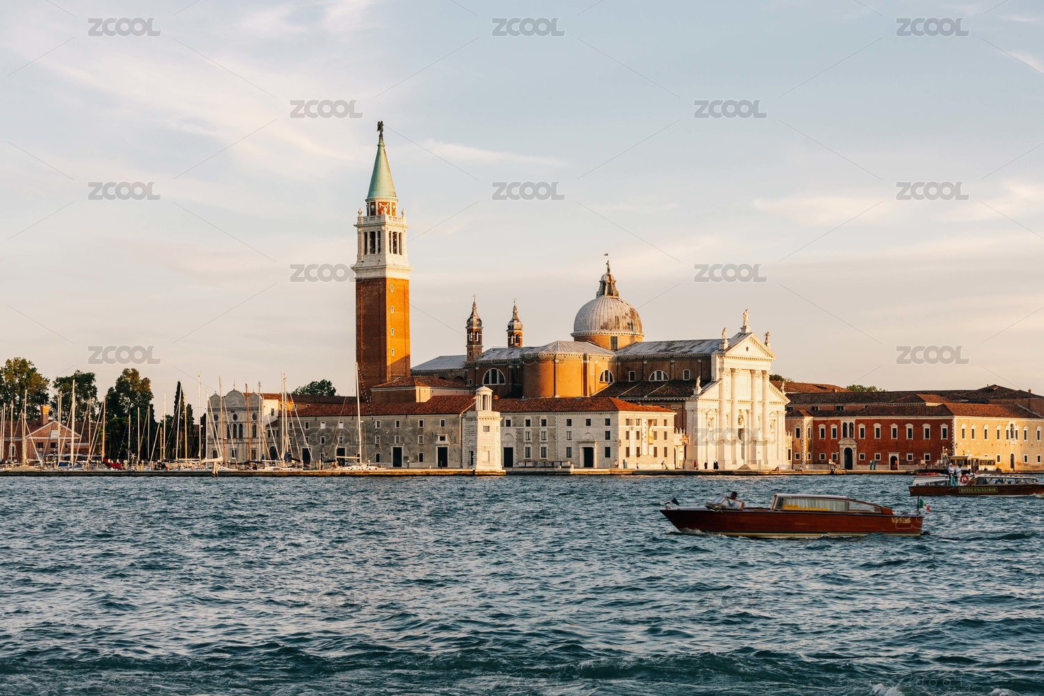 从意大利威尼斯圣马可钟楼顶端眺望远处的圣乔治马焦雷岛海港和圣乔治大教堂