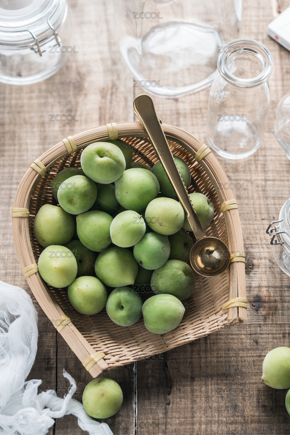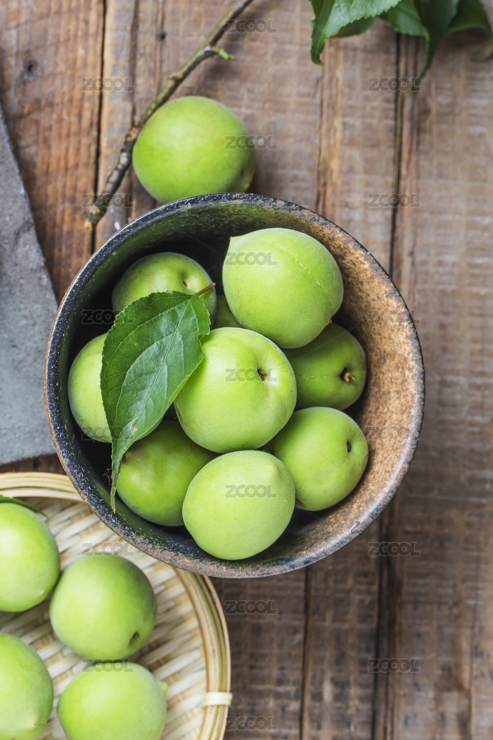 放在竹篮里的中国春季新鲜青梅