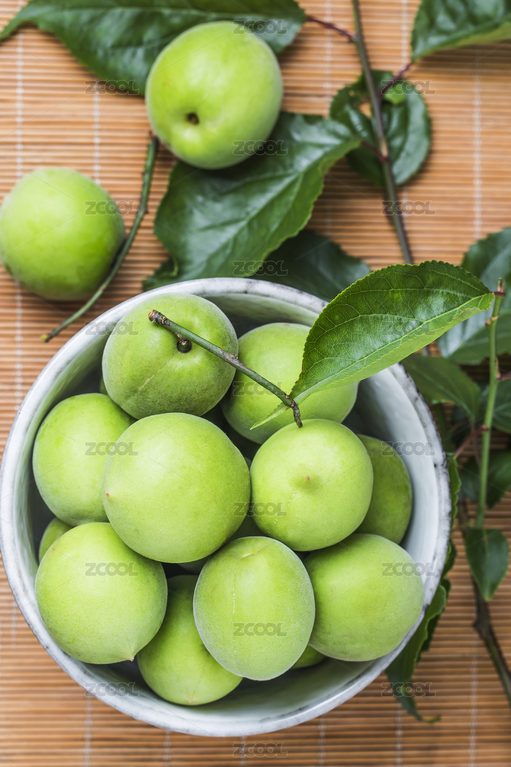 白底上放着一堆青梅果和切开两半边的青梅