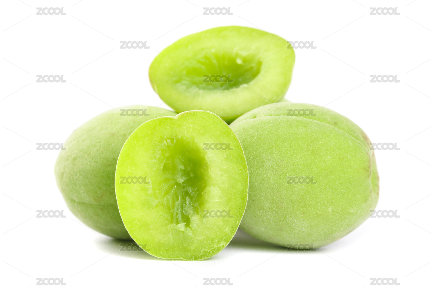 白底上切开半个的青梅鲜果