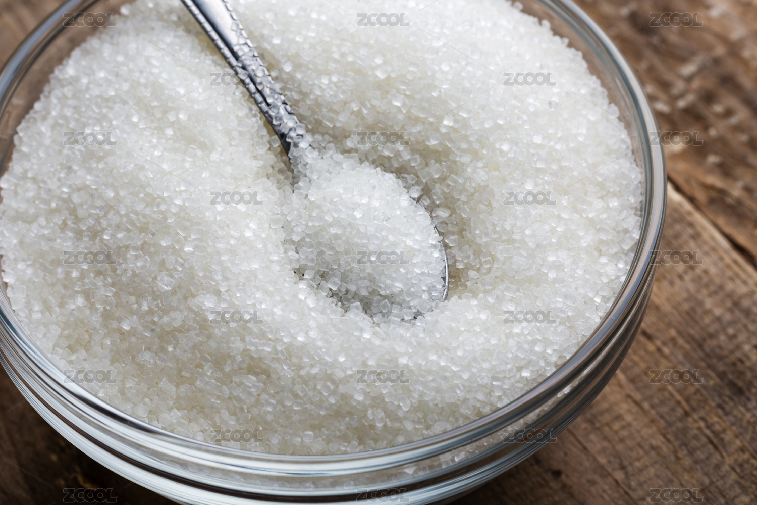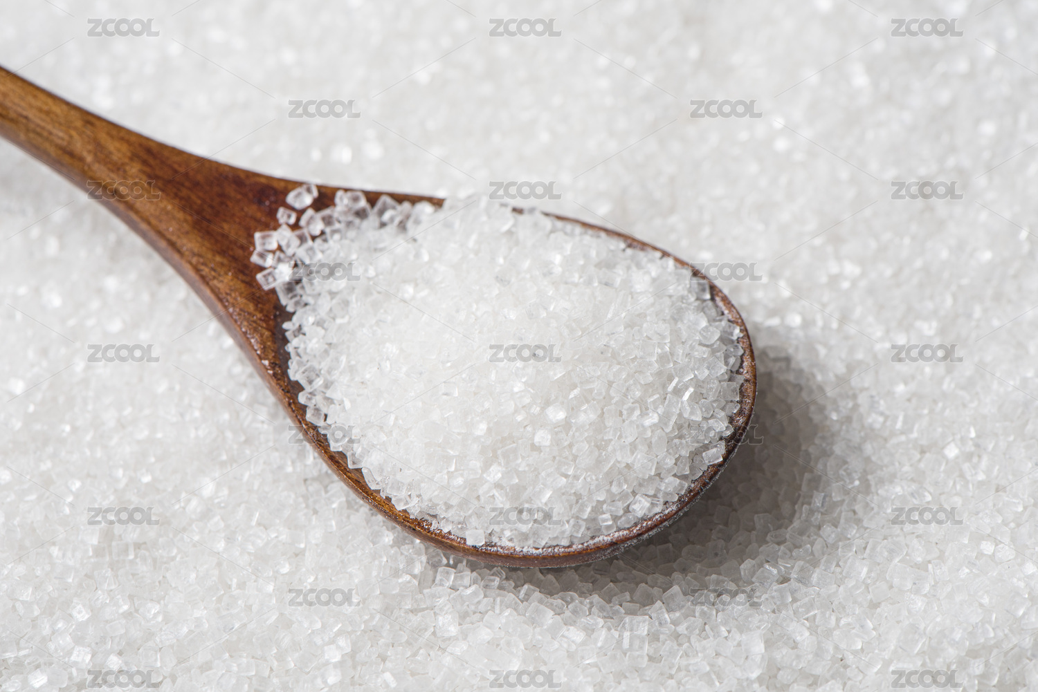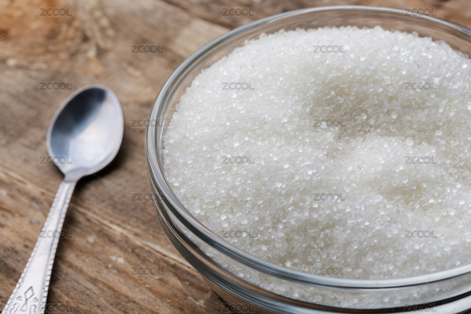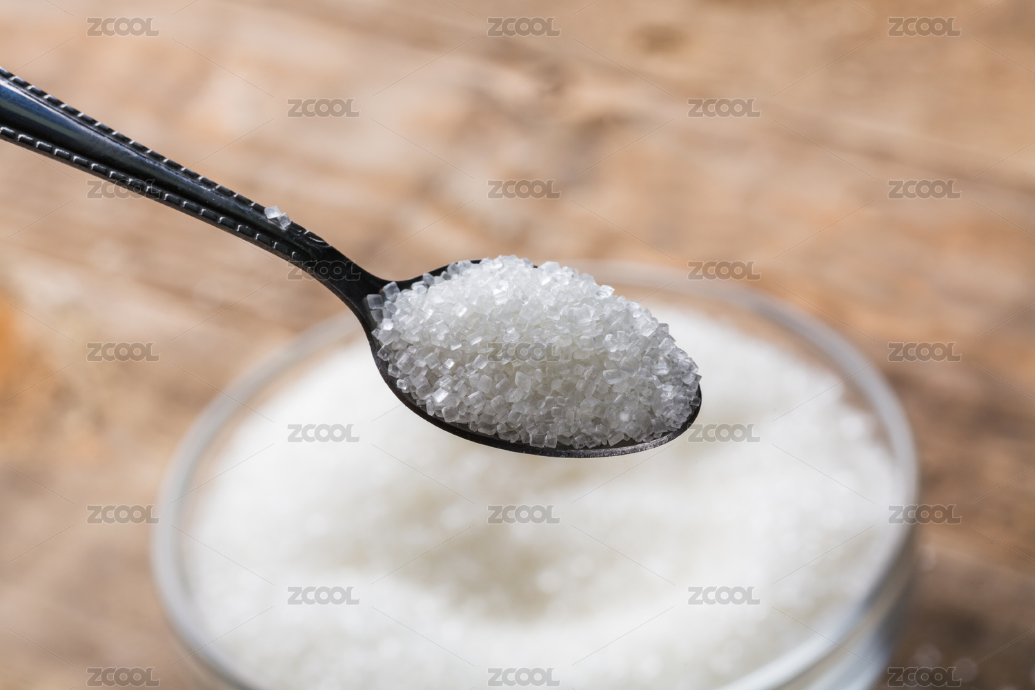 白糖和银色的勺子在桌子上,白糖的特写镜头