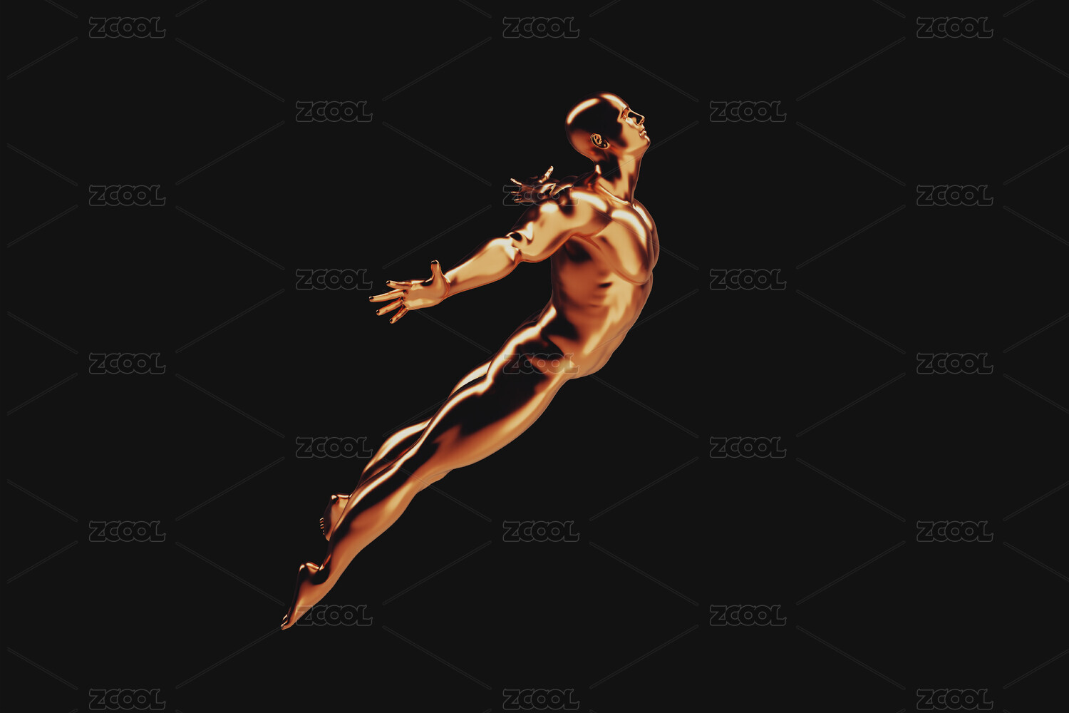 3D渲染黄金质感的强壮的男性身体在纯色黑背景下飞跃,健康,生活习惯和运动健身概念的抽象创意背景