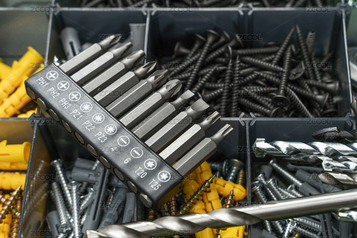 灰色桌面上的五金工具电钻螺丝刀和钉子