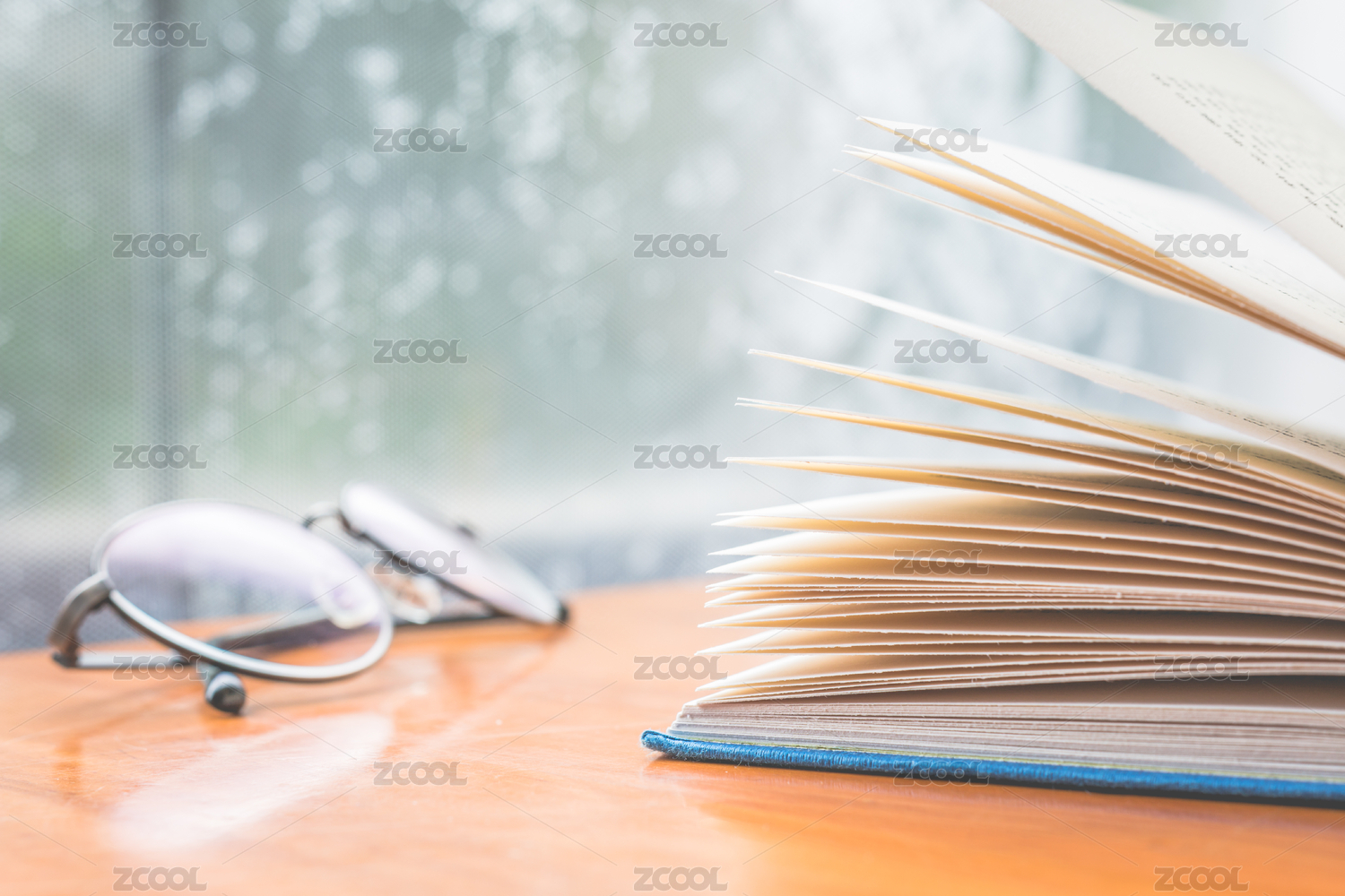 翻开的书和眼镜平放在桌子上