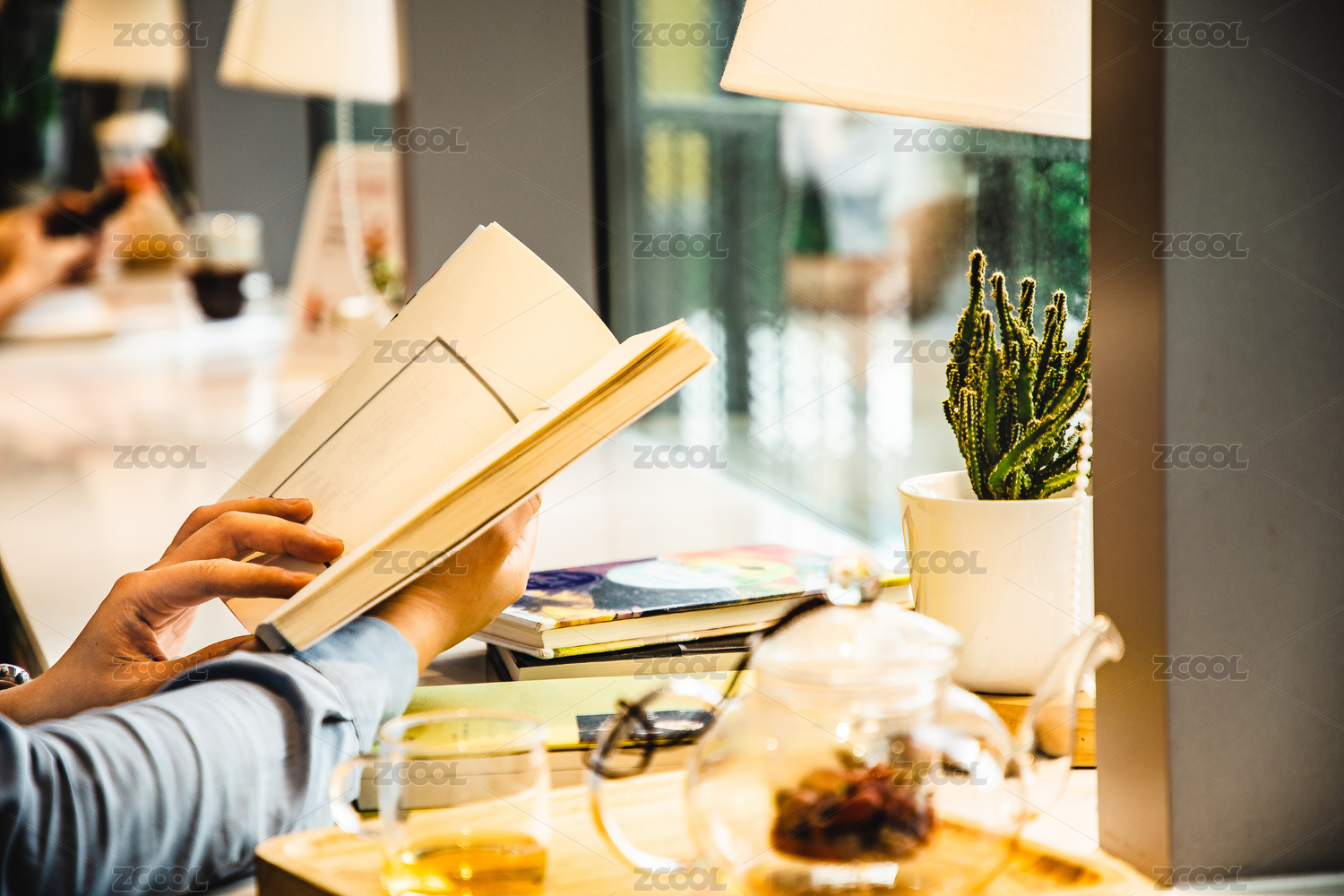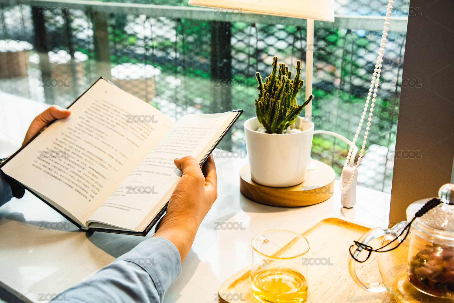 女性坐在落地窗边大理石长桌上翻开书阅读,桌上放着台灯仙人掌花茶等