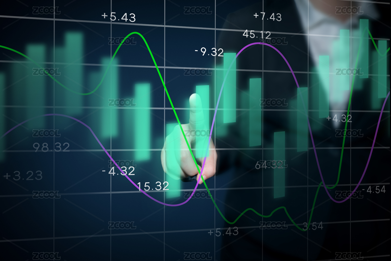 一个金融商务人士正在指着大盘股市股票的大数据流进行分析风险评估计算投资概念