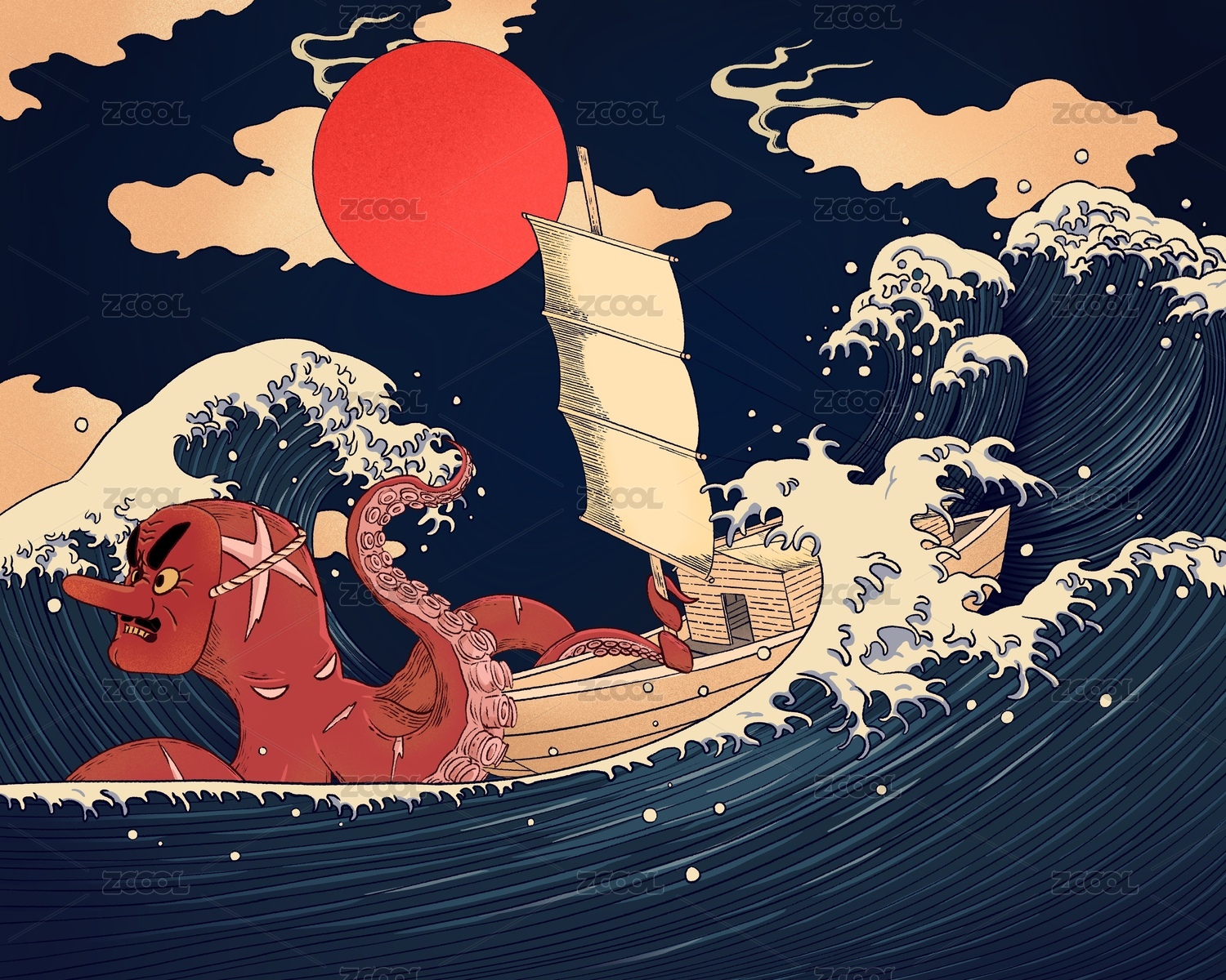 滔天巨浪中的章鱼和渔船,浮世绘风格插画