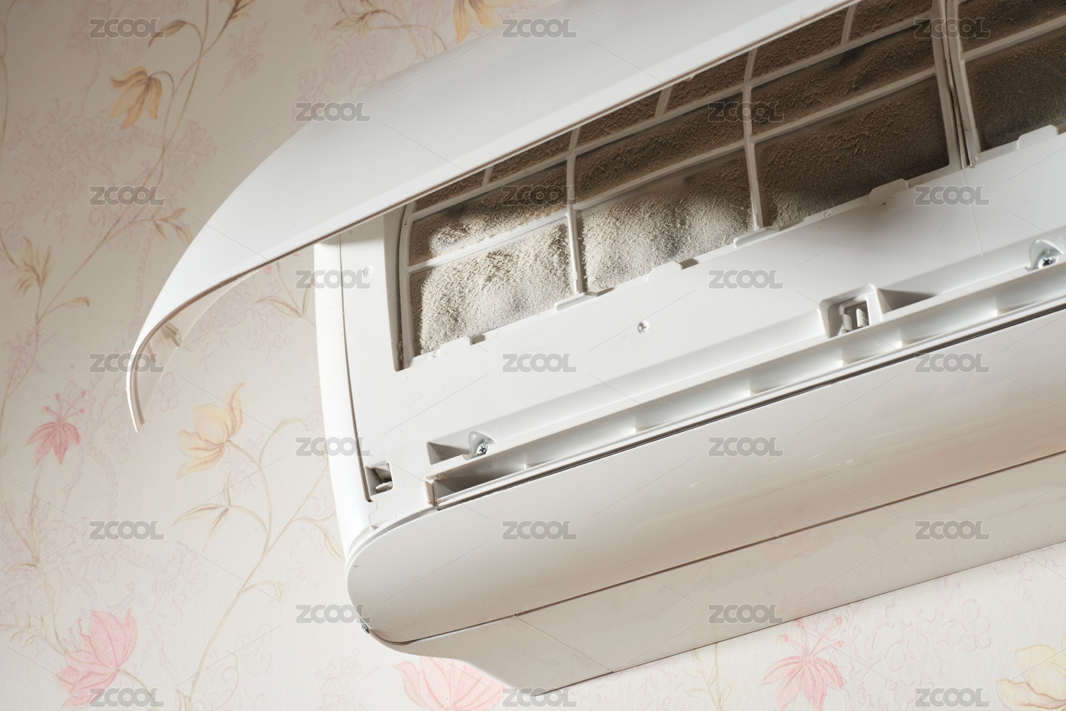 拆除家用空调沾满灰尘的过滤网
