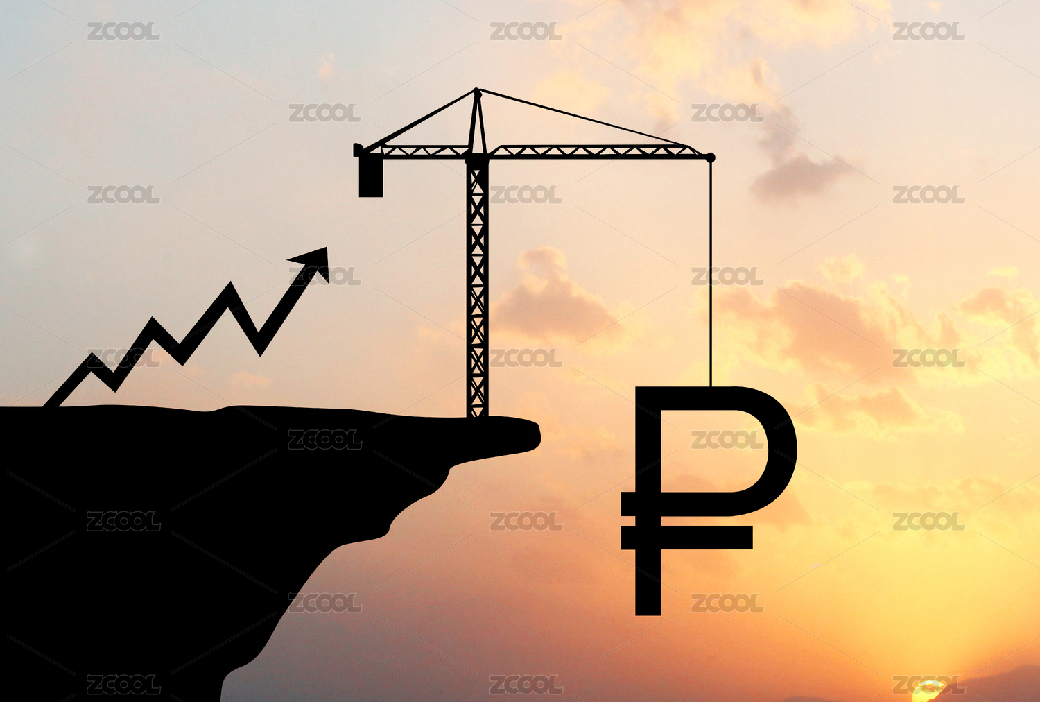 日落前的山崖剪影上一个吊着卢布符号的塔吊及一旁增长的箭头