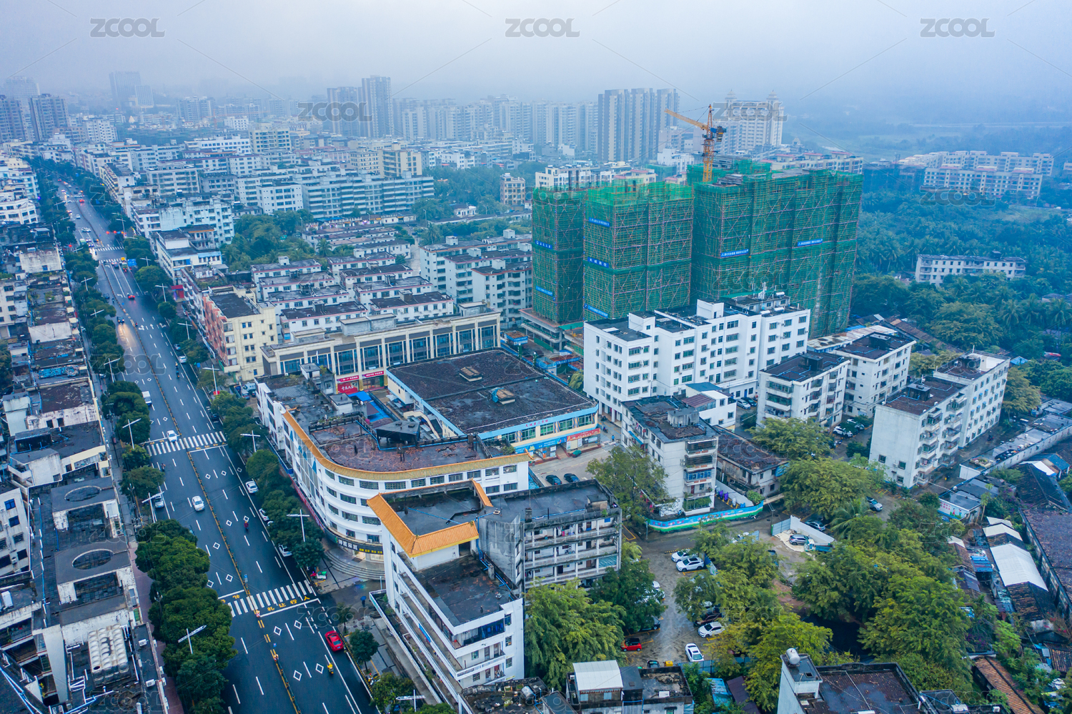 航拍海南文昌傍晚雨雾中的城市湿润烟雨朦胧