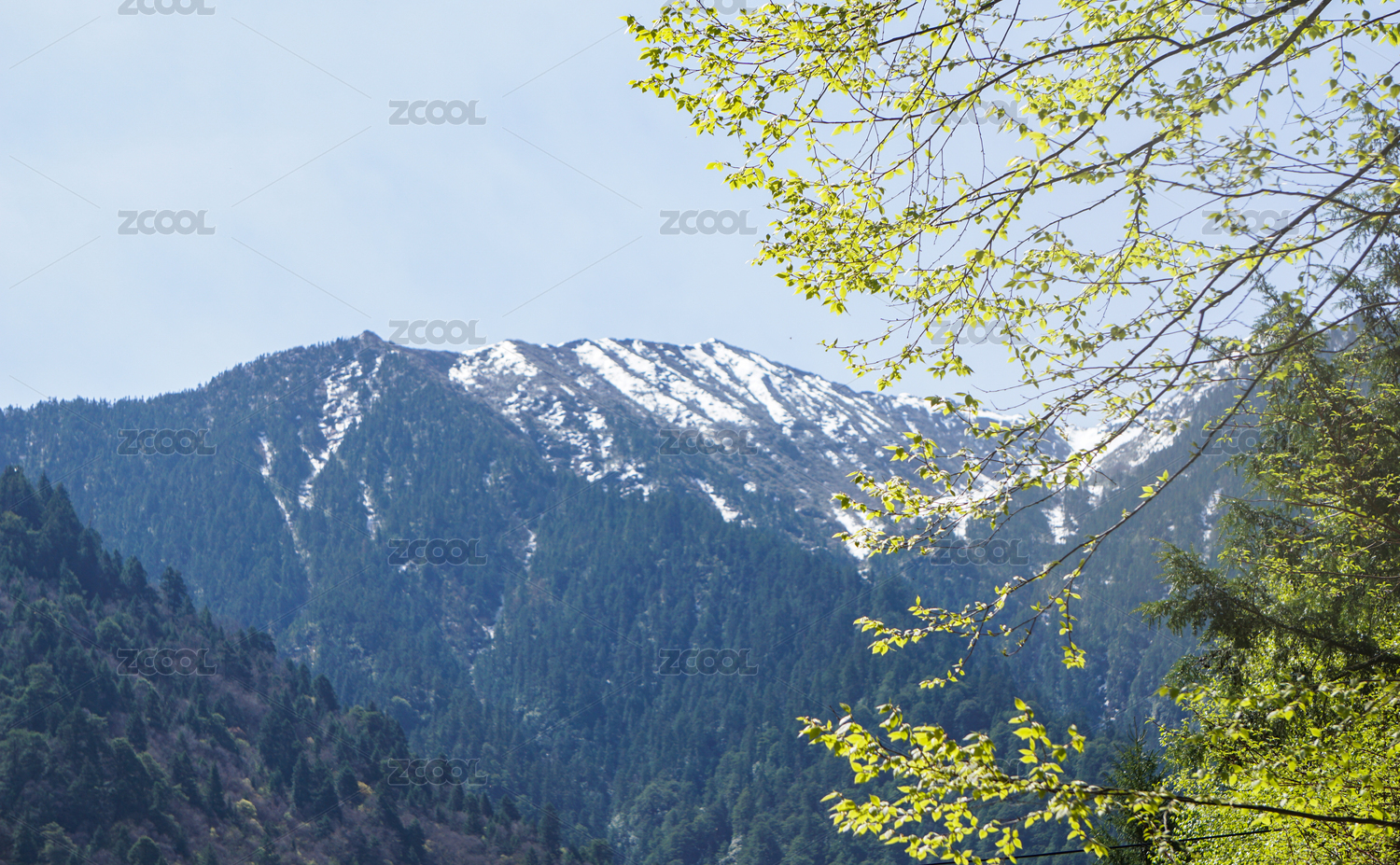 春天雪山与森林发出的绿芽