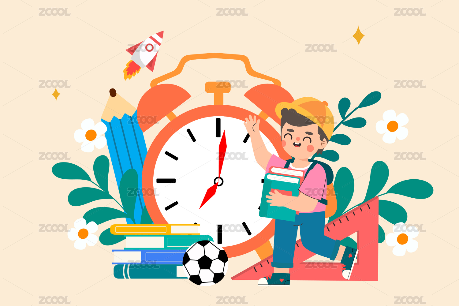 小学生把握时间好好学习矢量插画