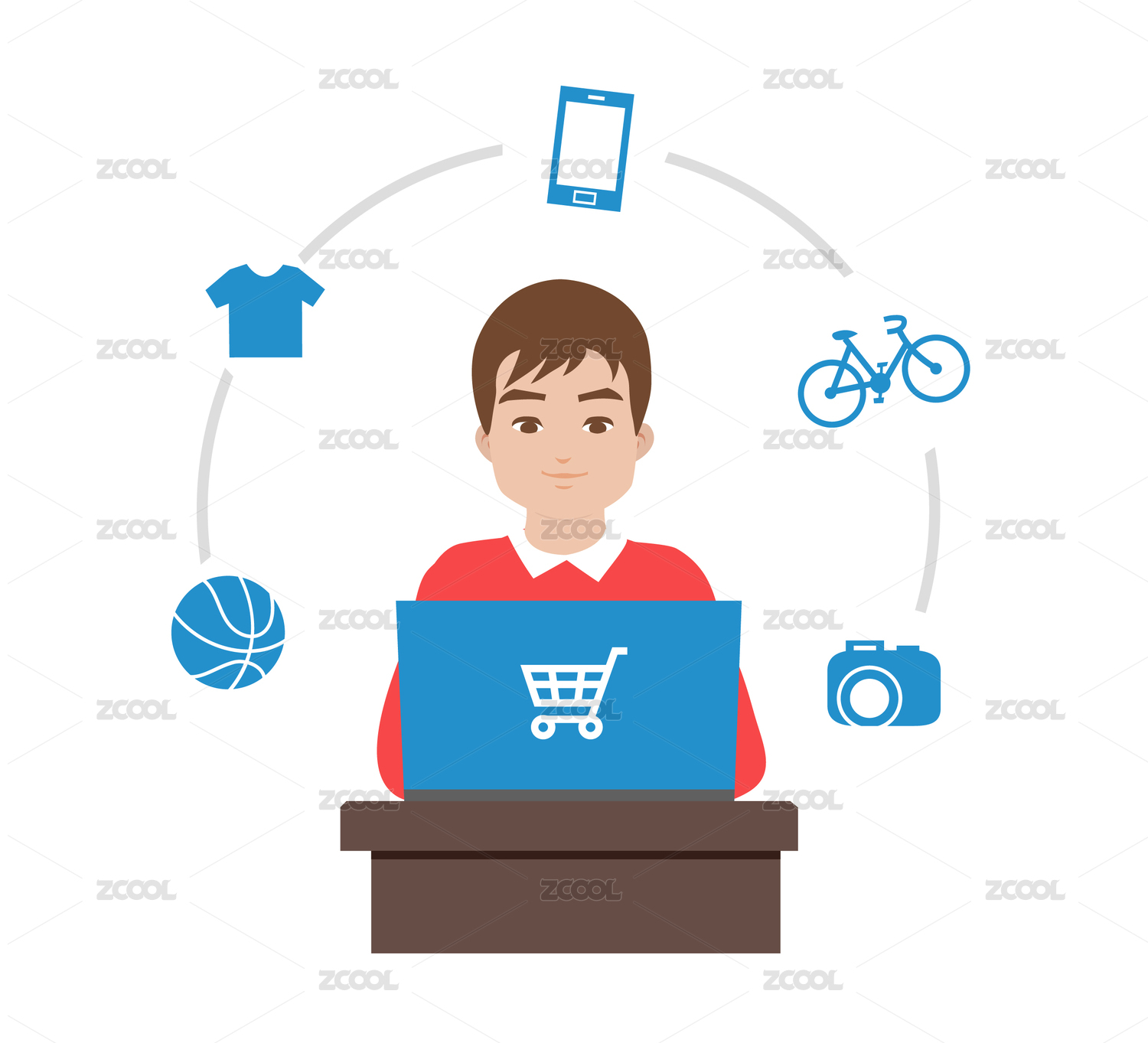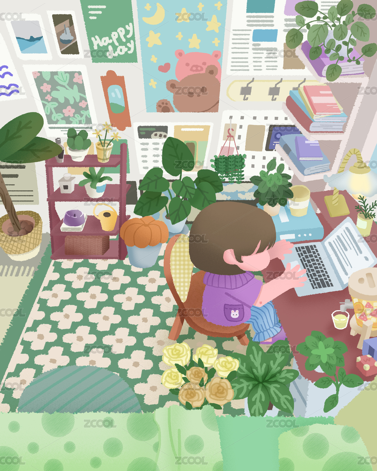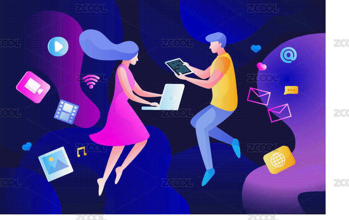 扁平风穿着黄色衣服女生在笔记本上上网冲浪