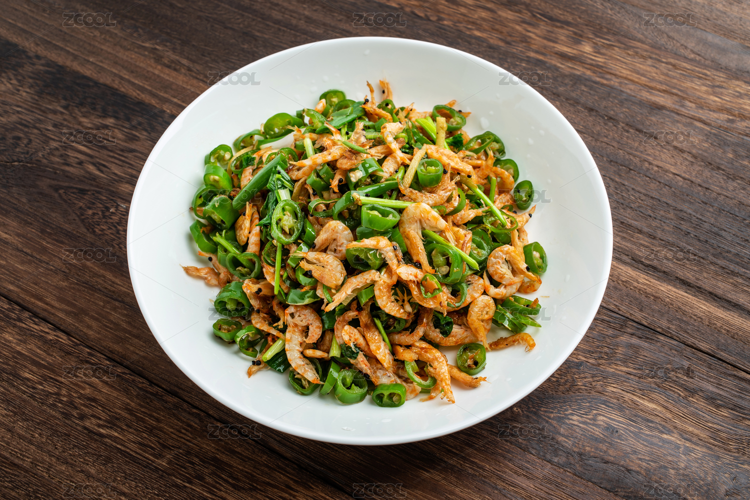 中国家常菜,一碟香辣红虾皮在木桌子上