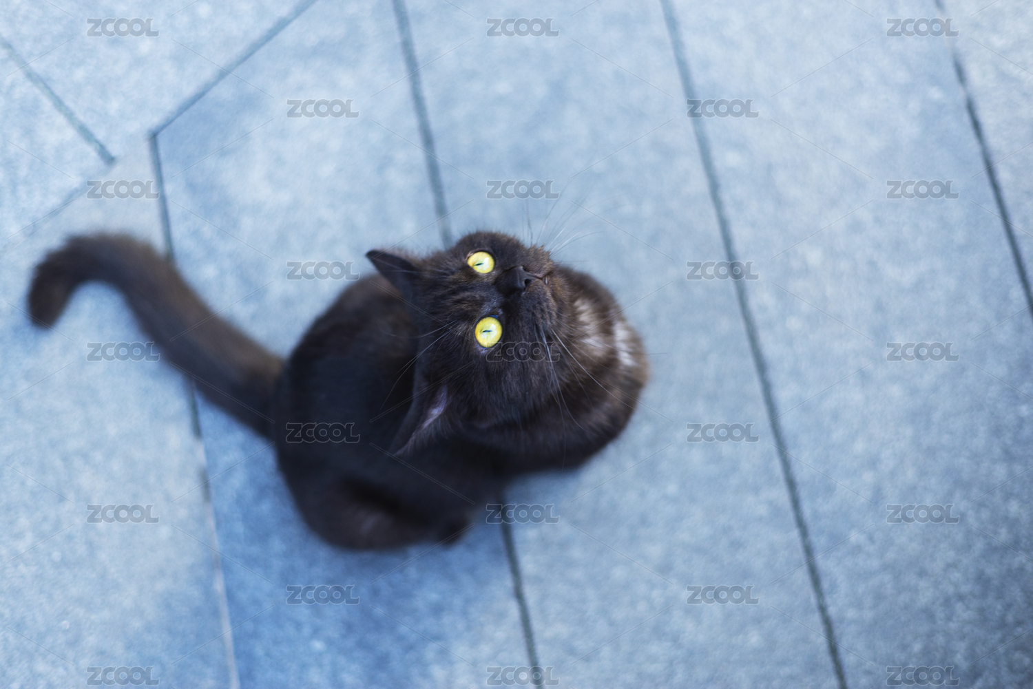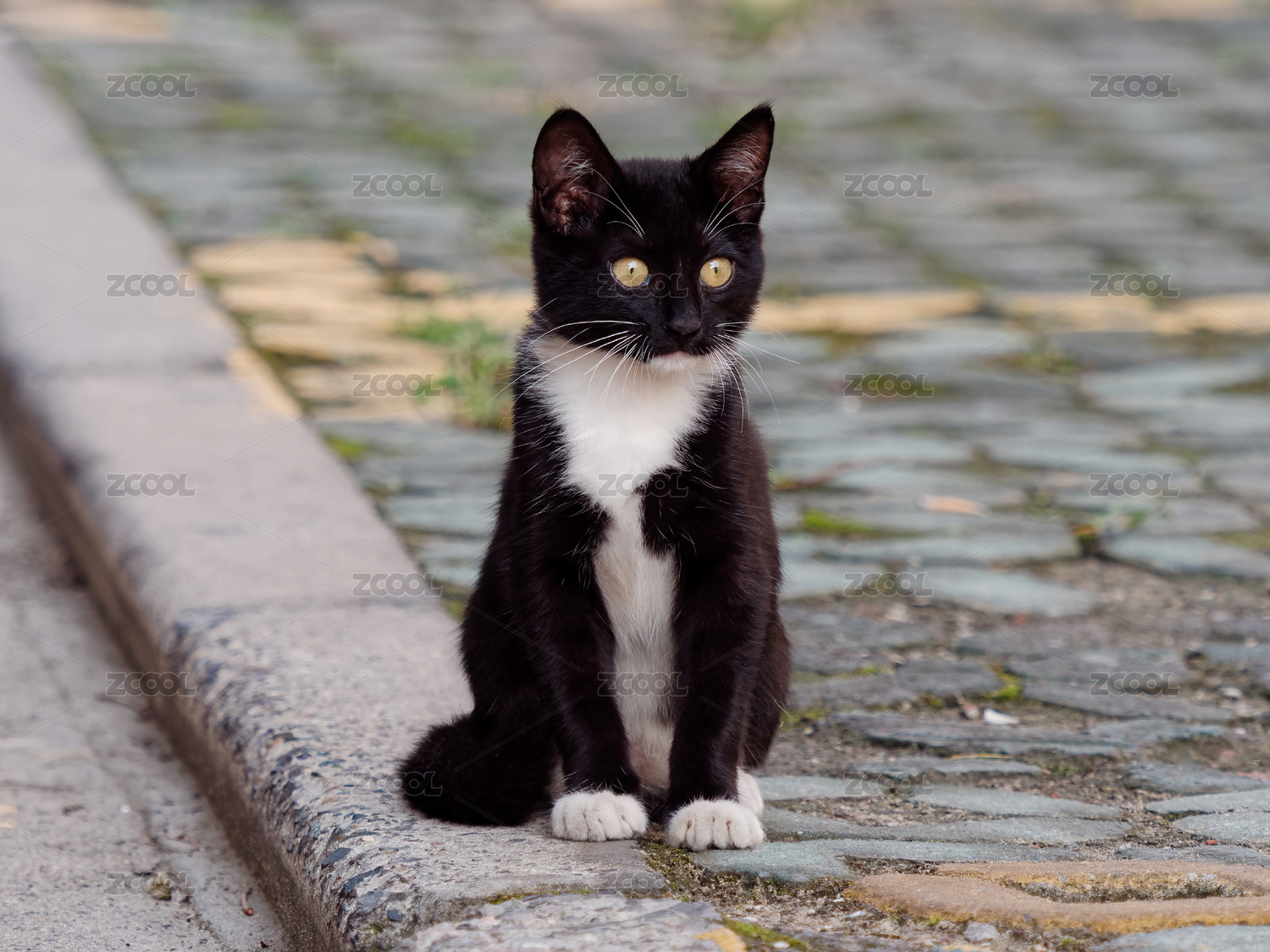 秋天一只小黑猫走在开了黄色菊花的山间小路上